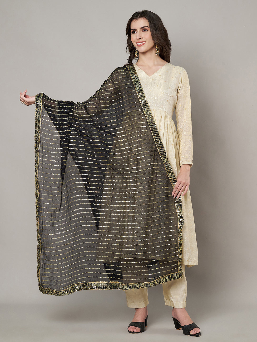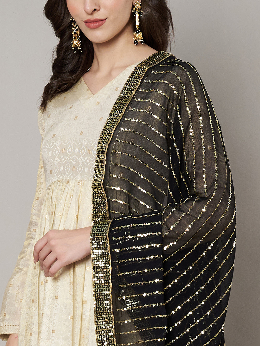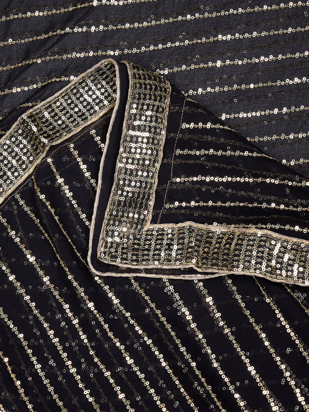 Black Chinon Dupatta with Gold Stripe Sequin Work & Gota Border (Size: 2.5x1 m Approx)