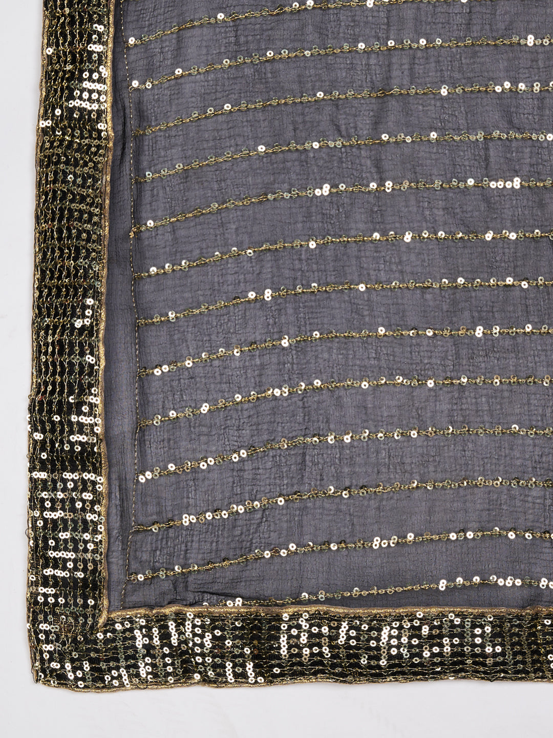 This elegant dupatta is crafted in soft chinon fabric, featuring fine gold stripe sequin work that creates a graceful, flowing pattern across the surface. The subtle shimmer adds a festive touch while keeping the overall look refined and balanced.