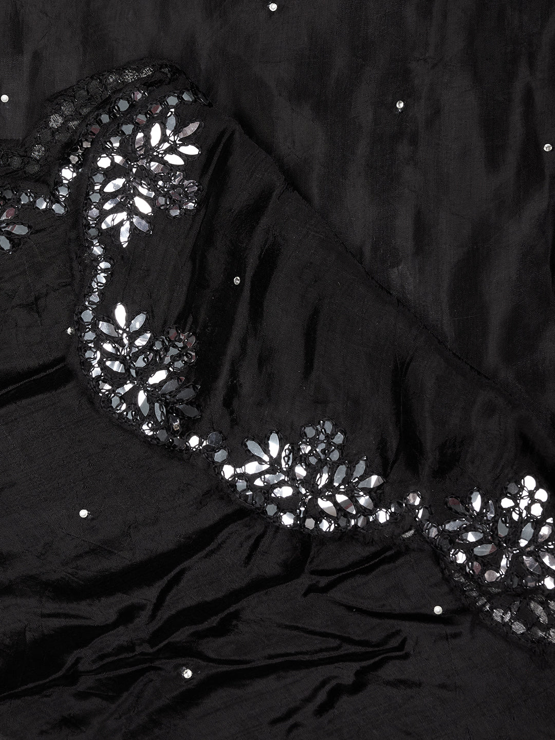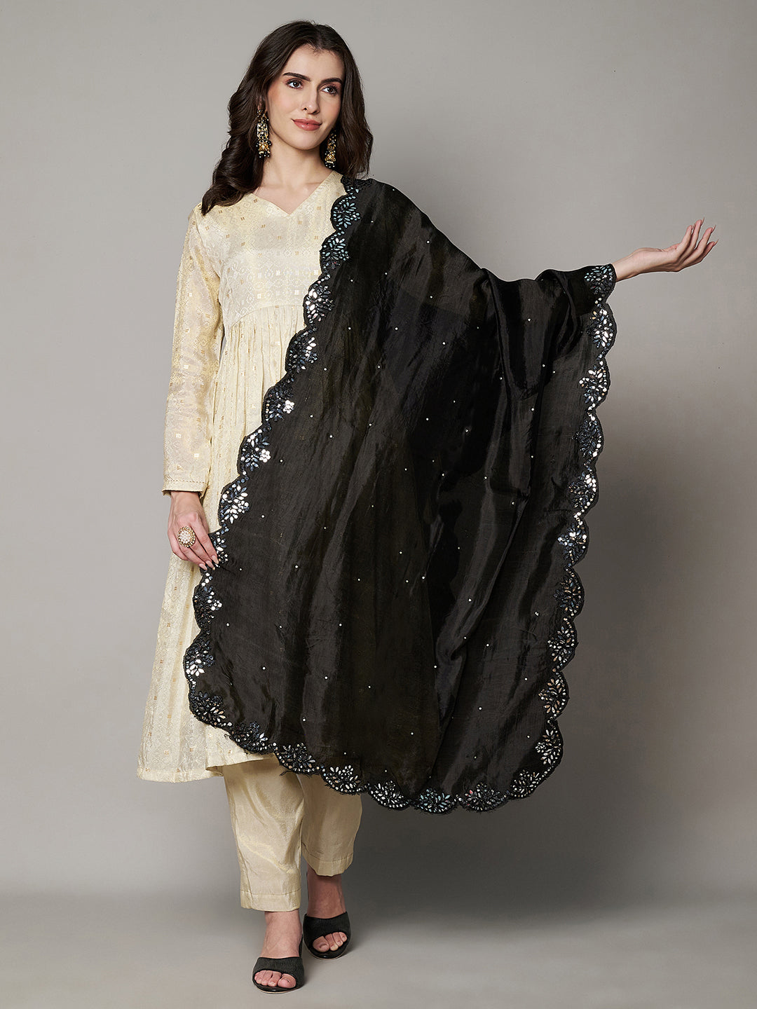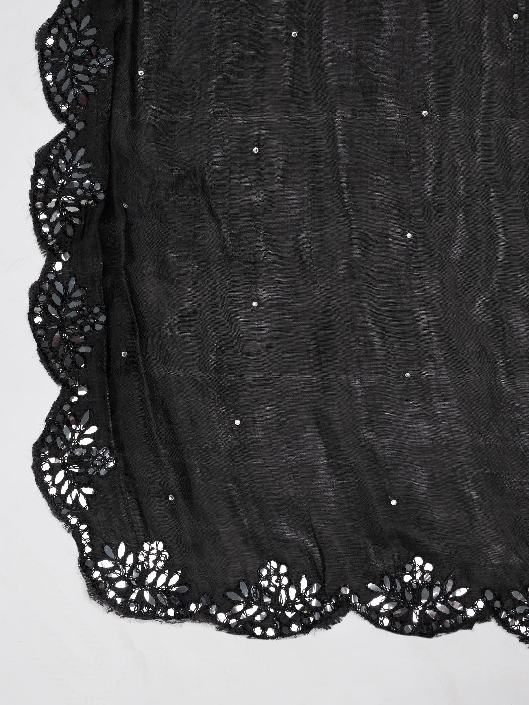 Black Silk Dupatta with Scalloped Cutwork Border & Sequin Highlights (Size: 2.5x1 m Approx)