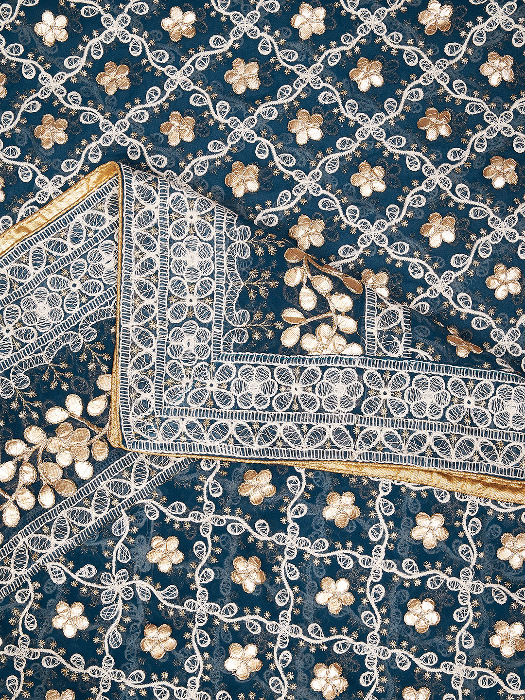 This elegant bottle green dupatta is crafted in lightweight georgette, offering a soft, sheer drape that flows beautifully. The dupatta features an all-over lattice pattern adorned with delicate gold foil booti motifs, adding a rich festive shimmer without being overpowering. A finely detailed lace border, highlighted with gold foil accents, frames the dupatta gracefully and enhances its traditional appeal. Subtle yet luxurious, this georgette dupatta pairs effortlessly with solid or embroidered suits, making it ideal for festive occasions, weddings, poojas, and evening celebrations.