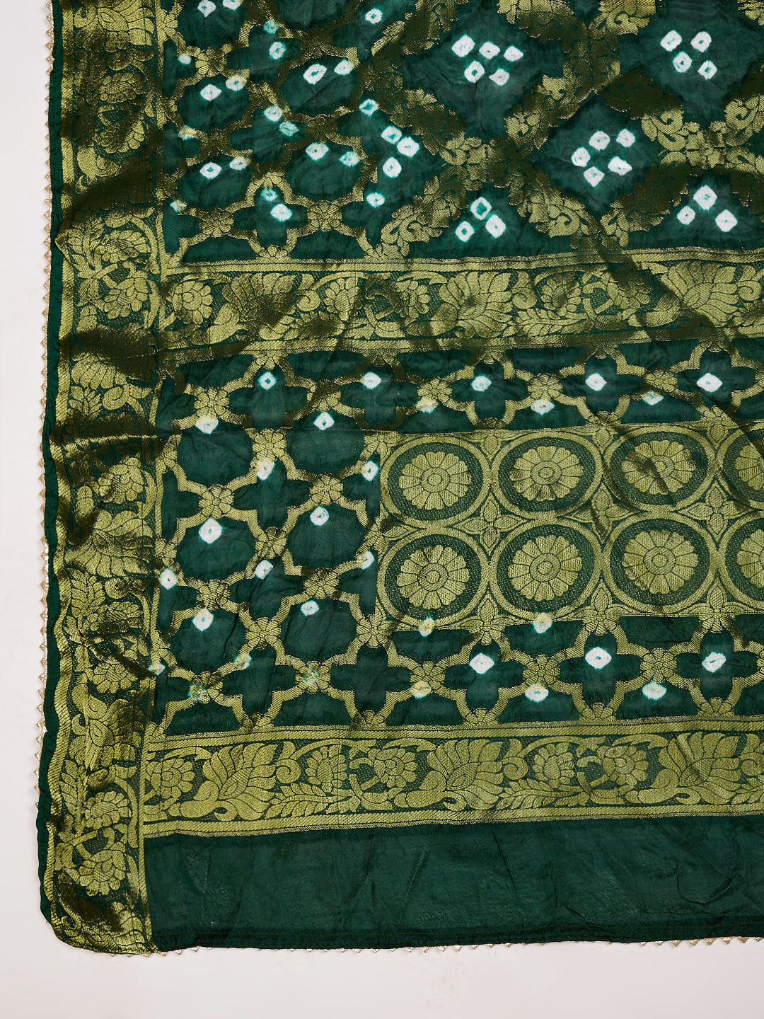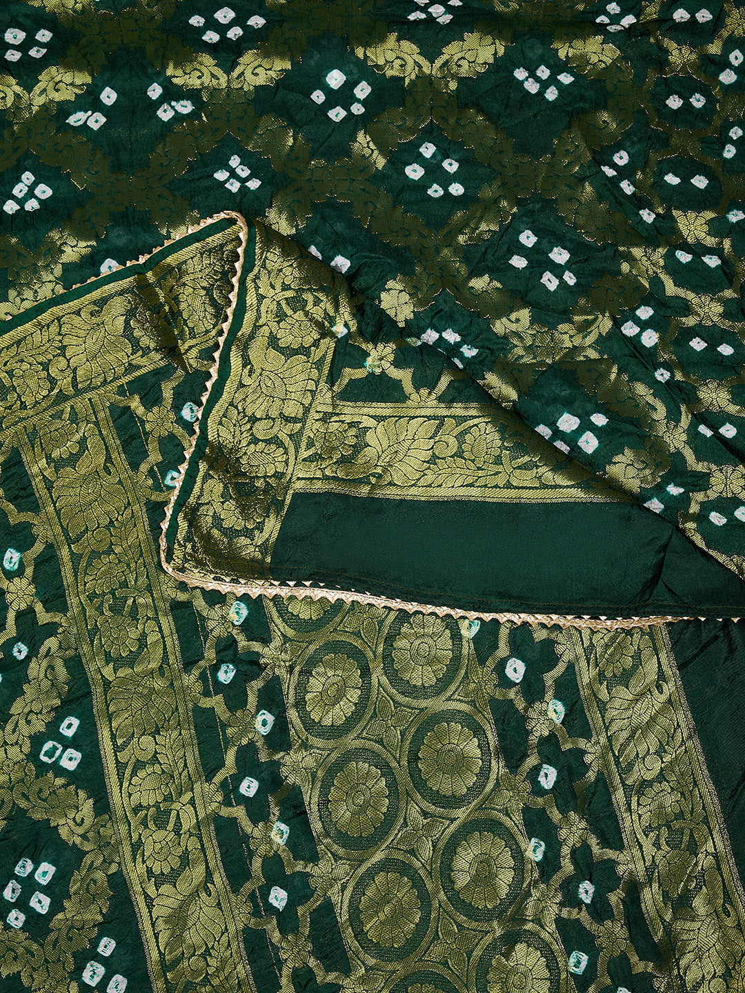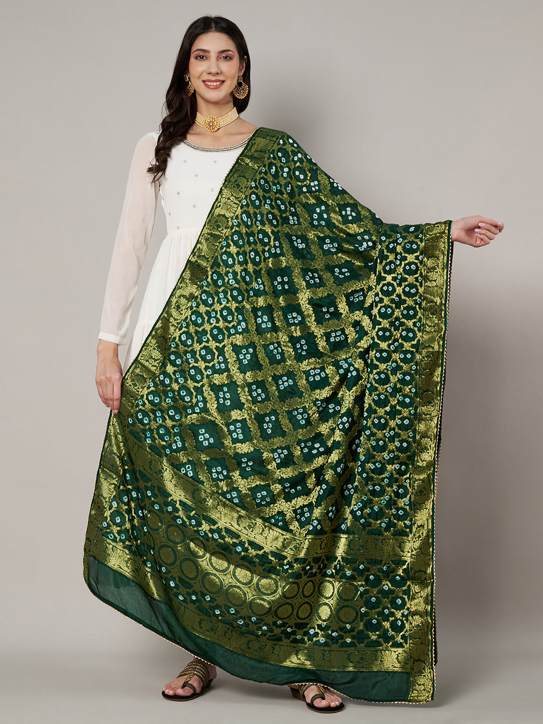 Green Silk Gharchola Bandhej Dupatta with Gold Zari Border (Size: 2.5x1 m Approx)