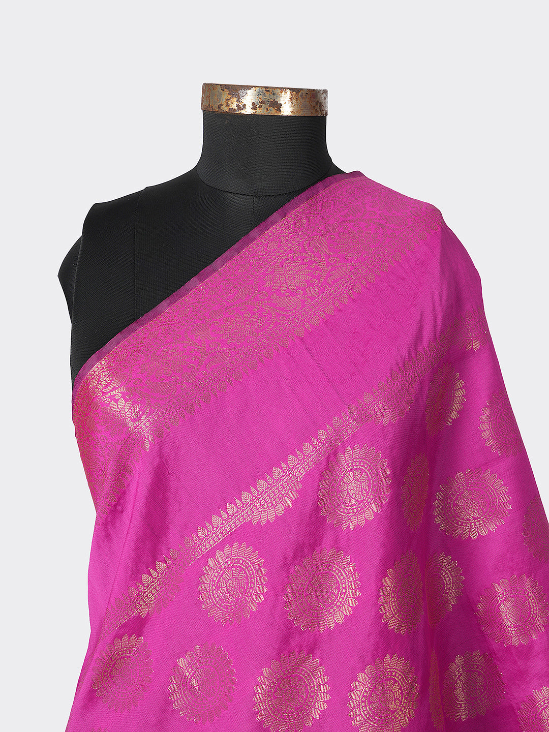 This graceful Banarasi dupatta is crafted from premium silk, featuring a rich rani pink base highlighted with elegant all-over woven gold zari butti motifs that add a subtle festive shimmer. The design is enhanced with a classic Banarasi zari border and neatly finished edges, giving it a timeless and refined appeal. The smooth, lustrous silk drapes beautifully, making it an ideal choice for weddings, festive celebrations, poojas, and traditional occasions, pairing effortlessly with solid or contrast ethnic outfits. Material: Silk | Size: Approx. 2.5 x 1 metres.