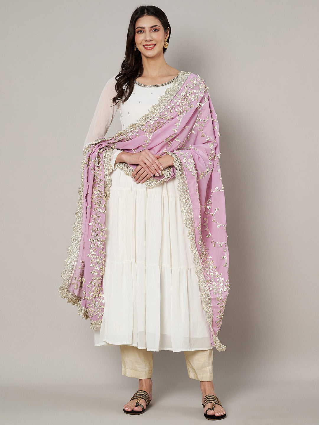 This stunning pink dupatta is crafted in flowy georgette fabric, beautifully adorned with hand-done gota patti work that creates an elegant, festive look. The intricate silver gota detailing forms graceful patterns across the dupatta, while the richly embellished border adds a luxurious finish. Lightweight yet visually rich, it drapes effortlessly and elevates any ethnic ensemble. Perfect for weddings, festive celebrations, and special occasions, this dupatta pairs wonderfully with ivory, gold, or solid-colored suits, making it a timeless statement piece for your wardrobe.
