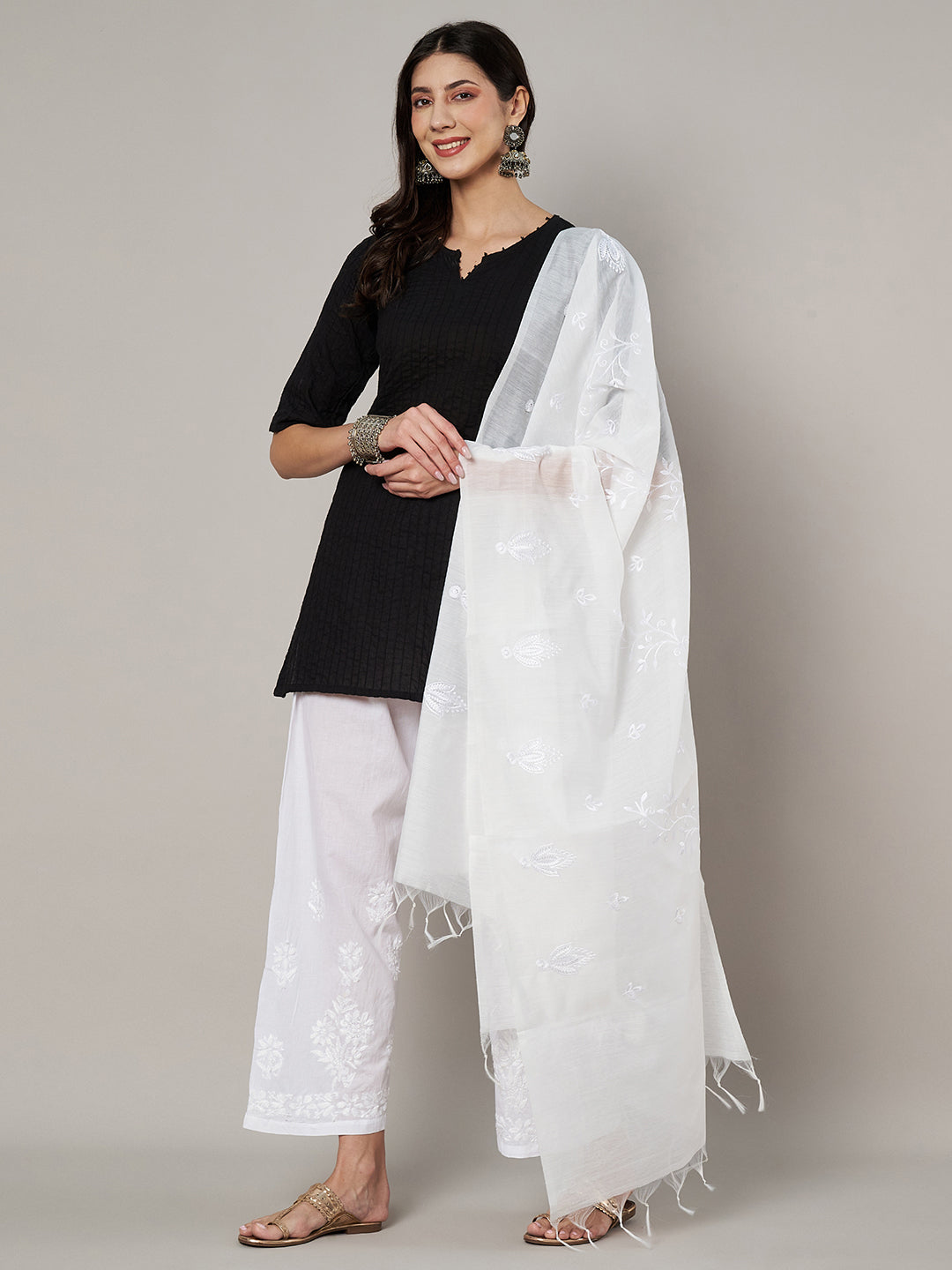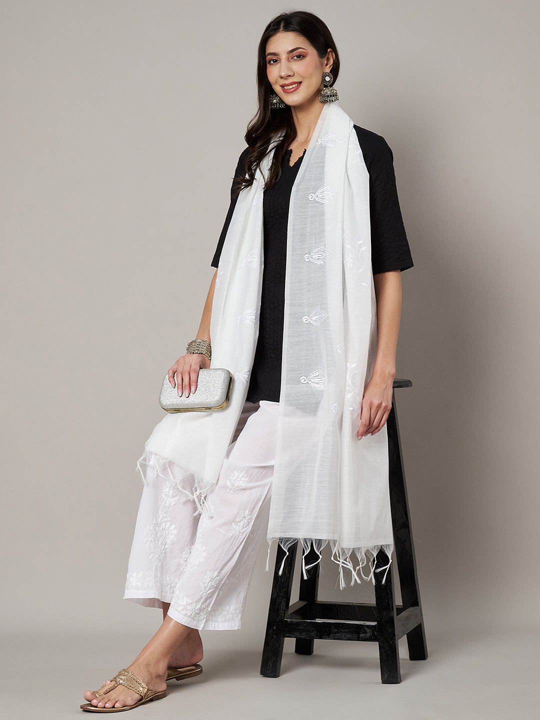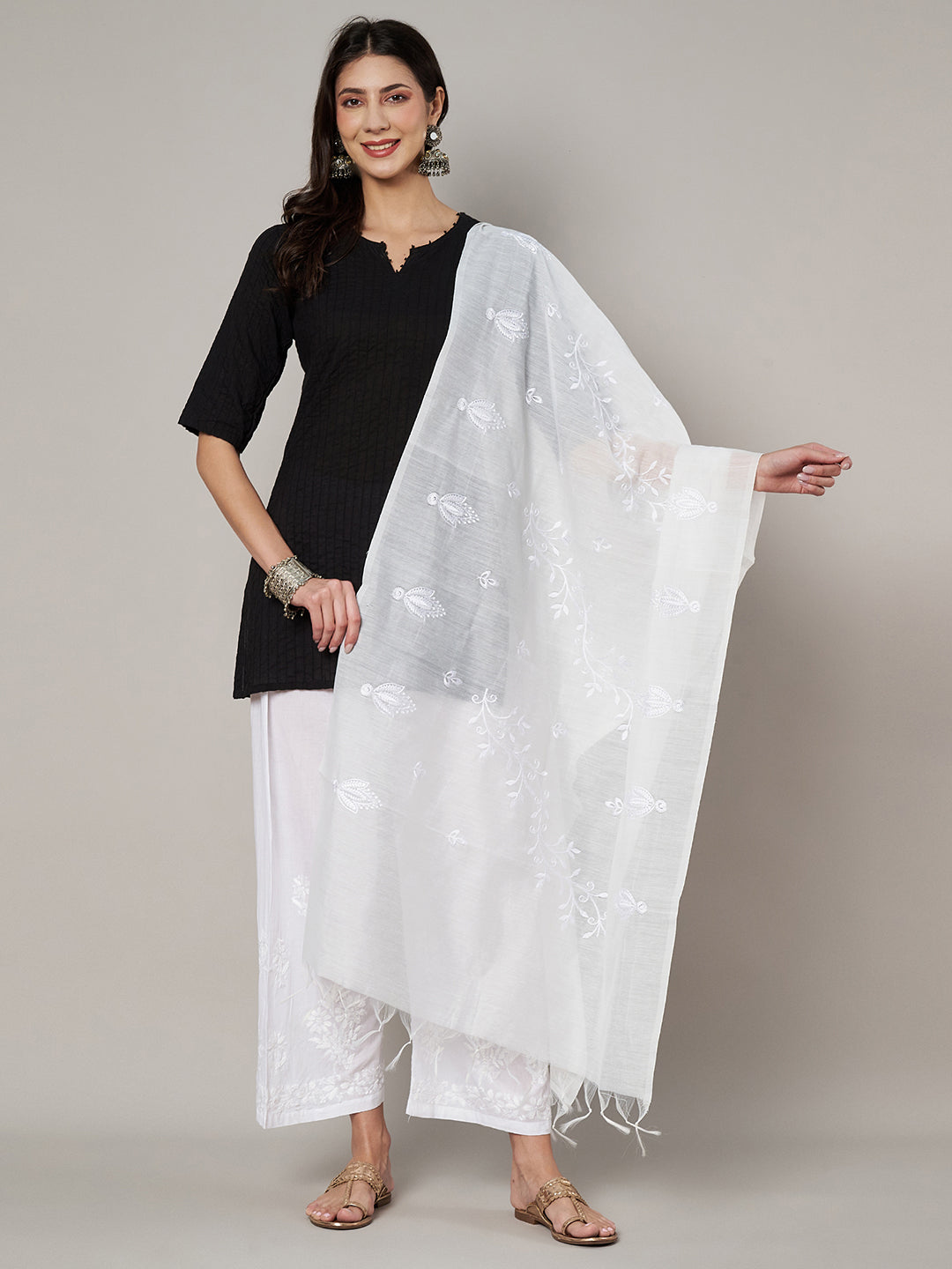 This elegant white Chanderi cotton dupatta showcases delicate floral embroidery scattered gracefully across the fabric, lending it a soft, handcrafted appeal. Crafted in lightweight Chanderi cotton, it offers a breathable, airy drape with a gentle sheen that enhances its understated charm. The tonal embroidery and fine detailing create a refined look, while the minimal border and soft tassels keep it effortlessly elegant. Perfect to pair with whites, pastels, or earthy tones, this dupatta is ideal for daytime festivities, festive gatherings, and sophisticated everyday ethnic wear.