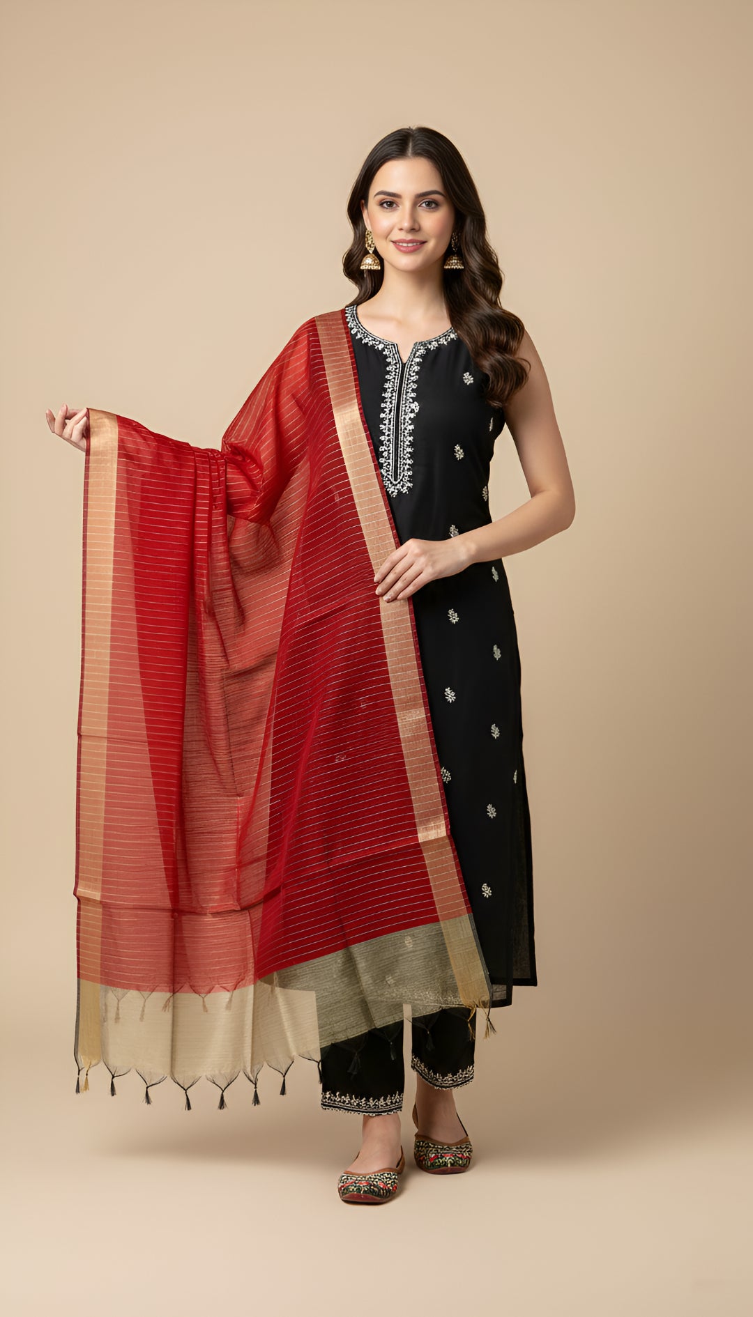 Designed to elevate ethnic ensembles with refined elegance, this women’s silk dupatta features a graceful striped weave that adds depth and a naturally elongated look to the drape. Crafted from smooth, lightweight silk, it offers a soft feel with a fluid fall that sits beautifully over the shoulders. The dupatta is highlighted with a subtle zari-accented border, lending it a touch of traditional sophistication while keeping the overall look balanced and versatile. Delicately finished edges with tassel detailing enhance its artisanal appeal and polished finish. Measuring approximately 2.5 metres, this dupatta pairs effortlessly with kurtas, suits, and festive outfits, making it ideal for daily ethnic wear, office styling, celebrations, and elegant occasions—perfect for women who appreciate classic patterns with timeless charm.