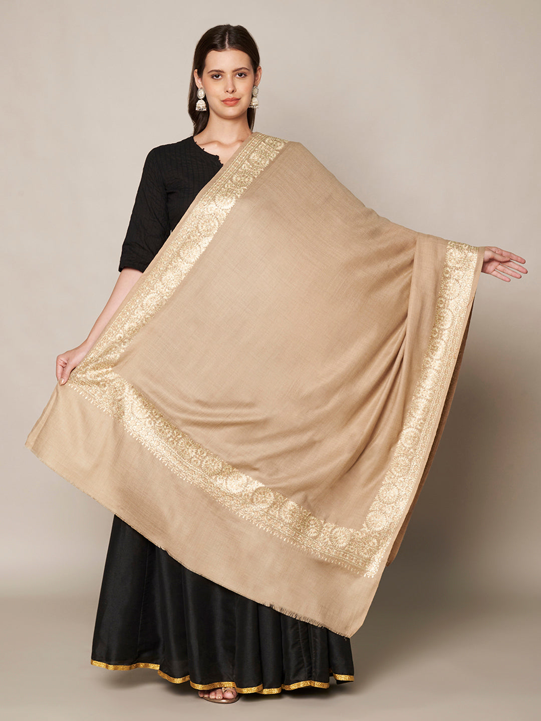 The highlight of this shawl is its rich golden embroidered border, featuring intricate traditional motifs that enhance its festive and luxurious look. The contrast between the bold beige base and the ornate gold detailing creates a striking yet refined aesthetic, making it a statement winter accessory.