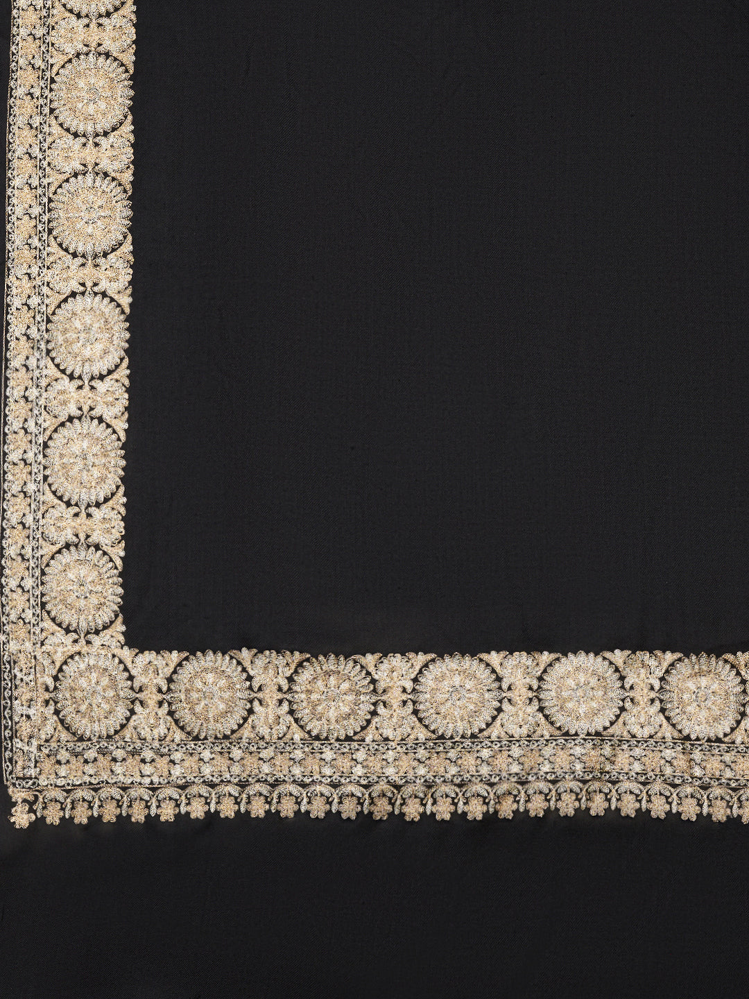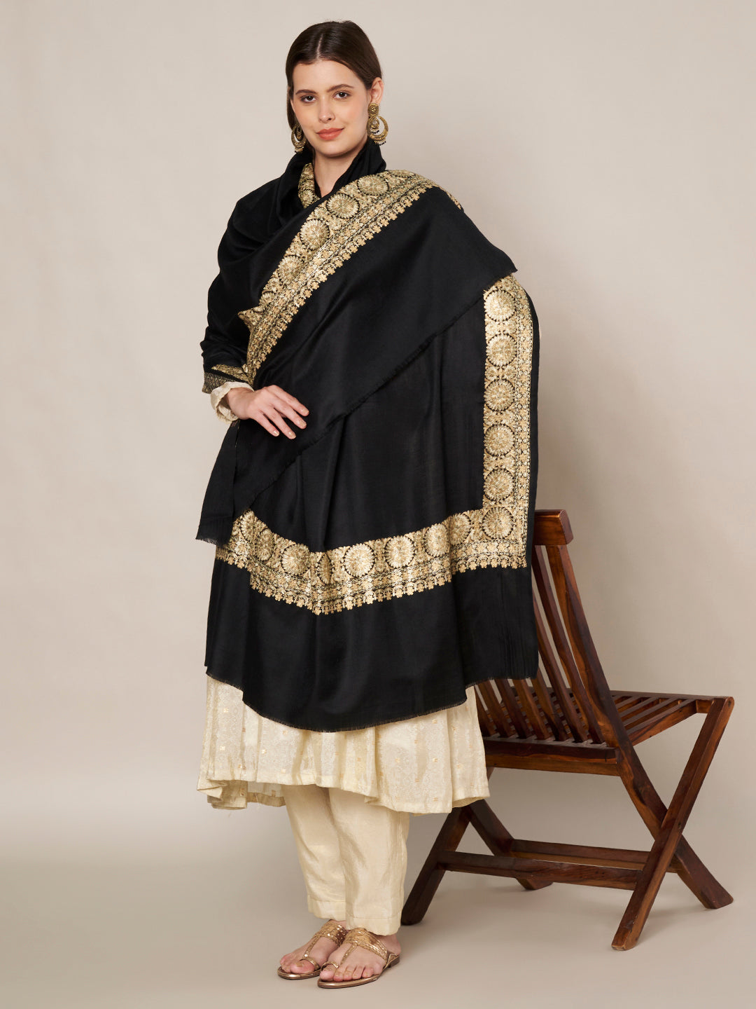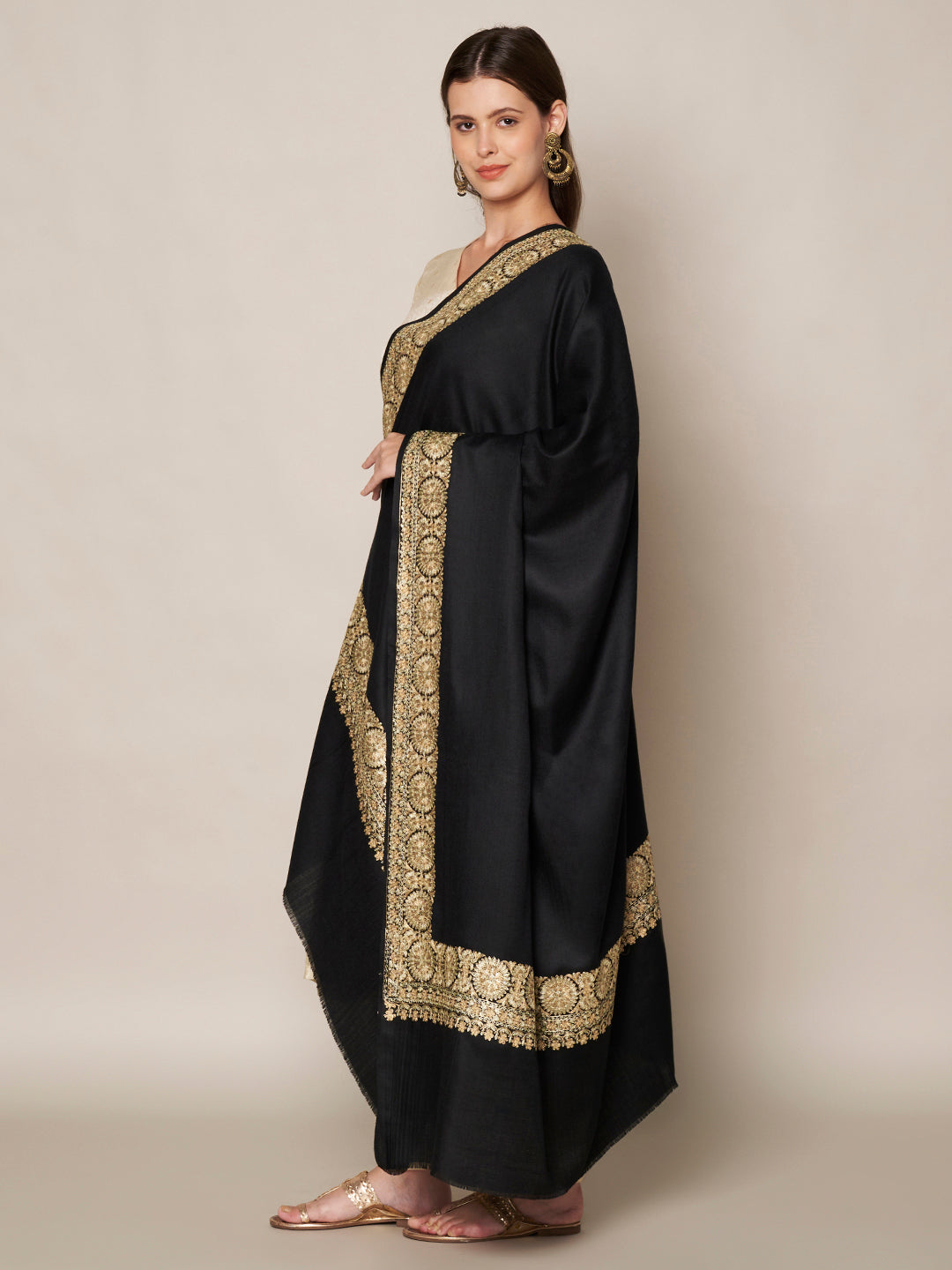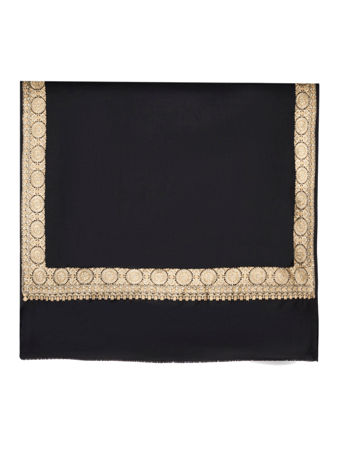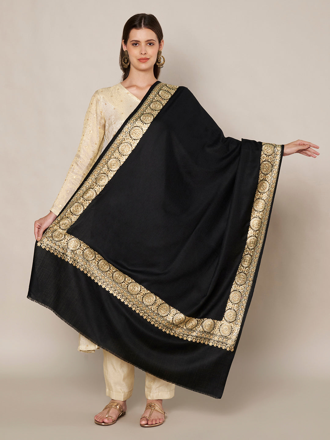 The highlight of this shawl is its rich golden embroidered border, featuring intricate traditional motifs that enhance its festive and luxurious look. The contrast between the bold black base and the ornate gold detailing creates a striking yet refined aesthetic, making it a statement winter accessory.