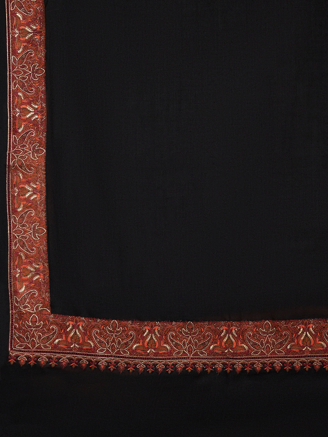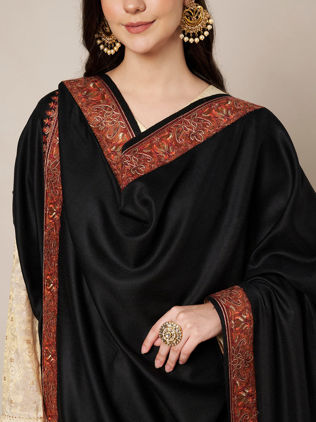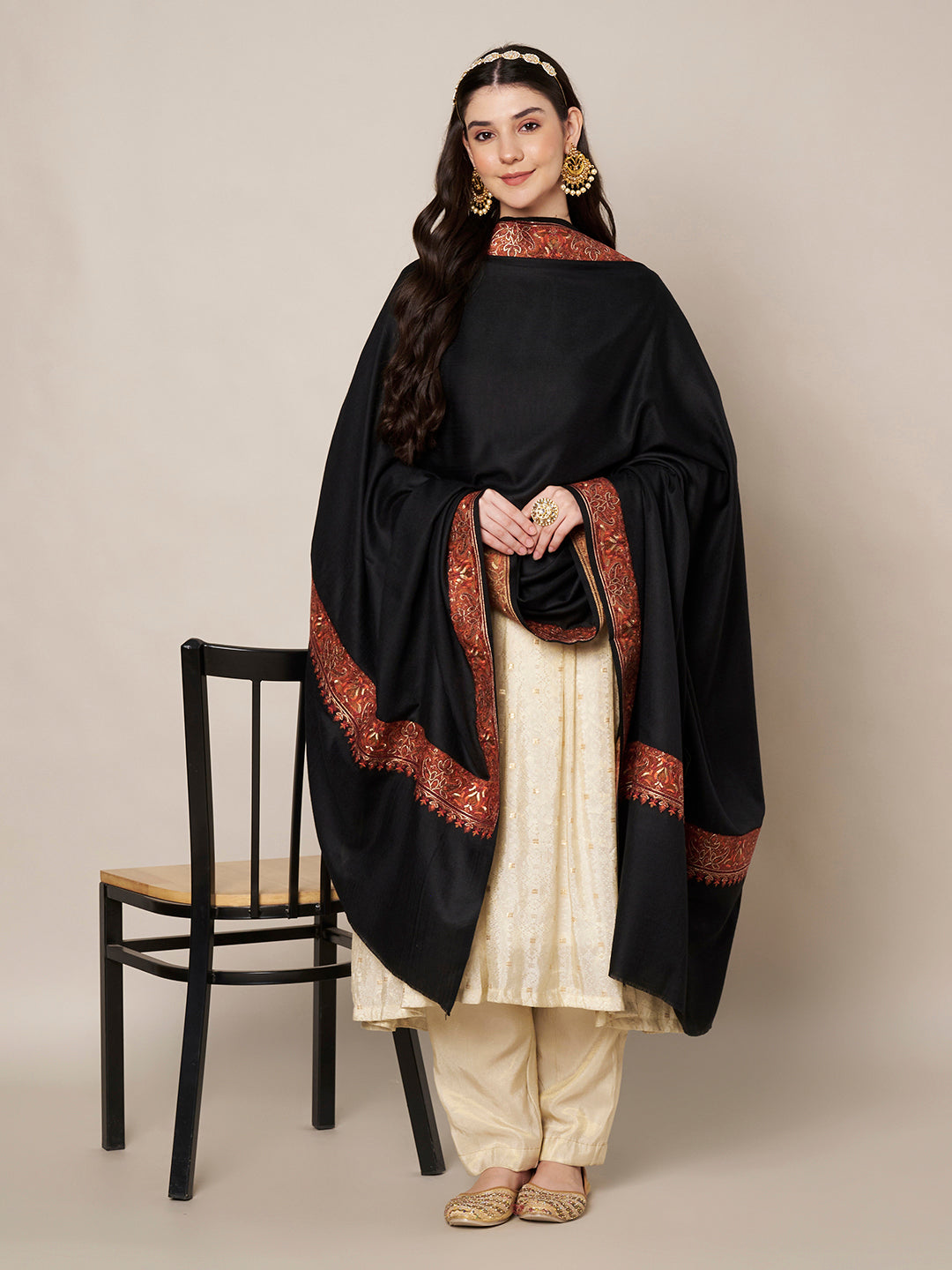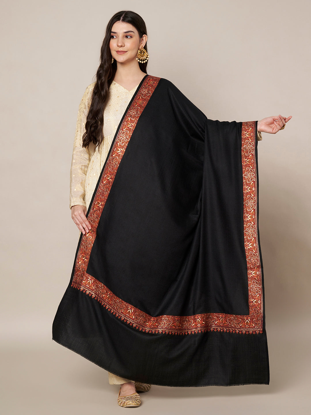Black Woolen Women Shawl with Traditional Multicolour Embroidered Border (80 x 40 Inches)
