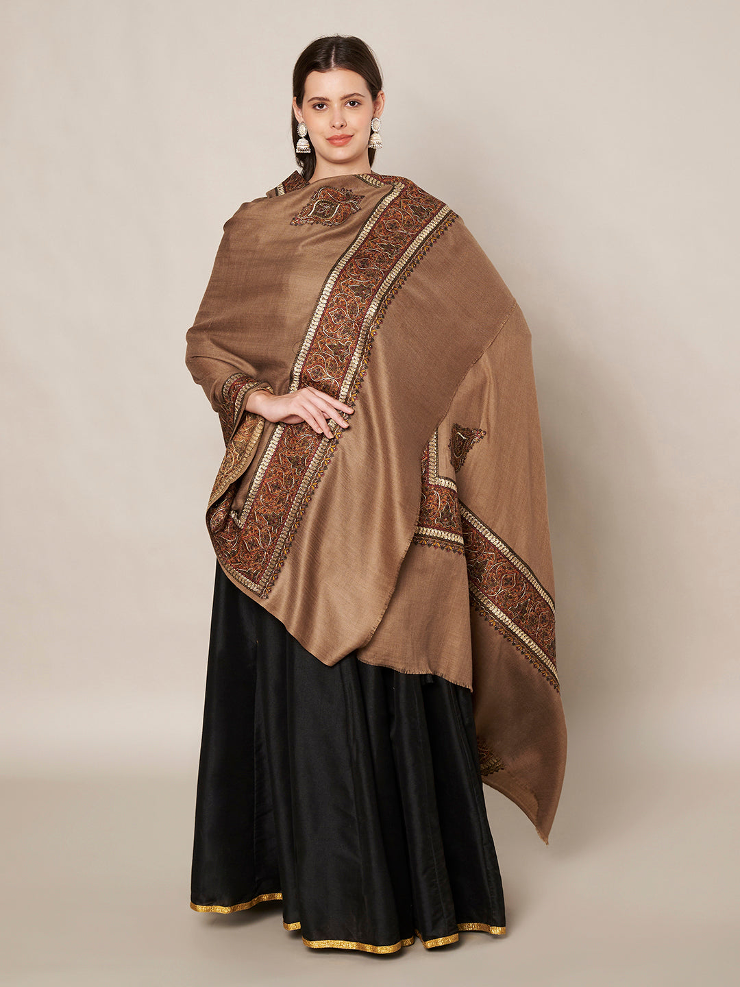 Brown Woolen Women Shawl with Intricate Embroidered Detailing – Winter Wrap (80 x 40 Inches)