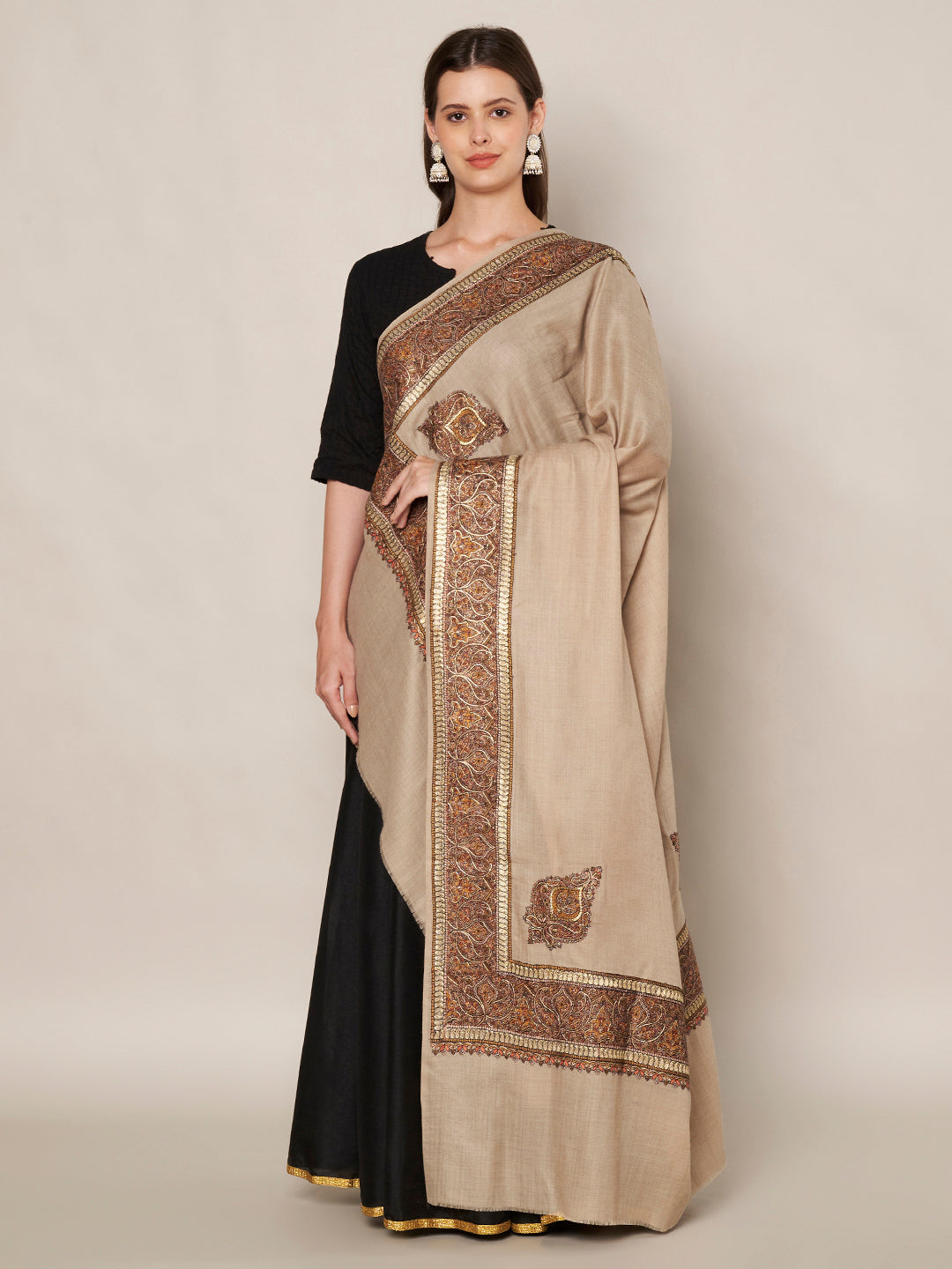 Light Brown Woolen Women Shawl with Intricate Embroidered Detailing – Winter Wrap (80 x 40 Inches)