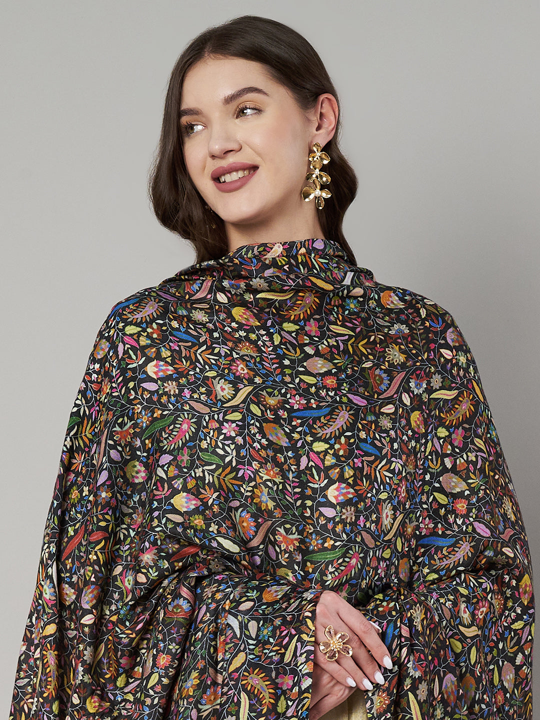 This women’s shawl is made from luxurious bamboo silk, offering a smooth texture, soft sheen, and an elegant, fluid drape. The shawl features a rich black base adorned with intricate all-over floral and vine-inspired prints in multicolour tones, giving it a vibrant yet refined look. A beautifully defined printed border adds depth and enhances its traditional appeal.