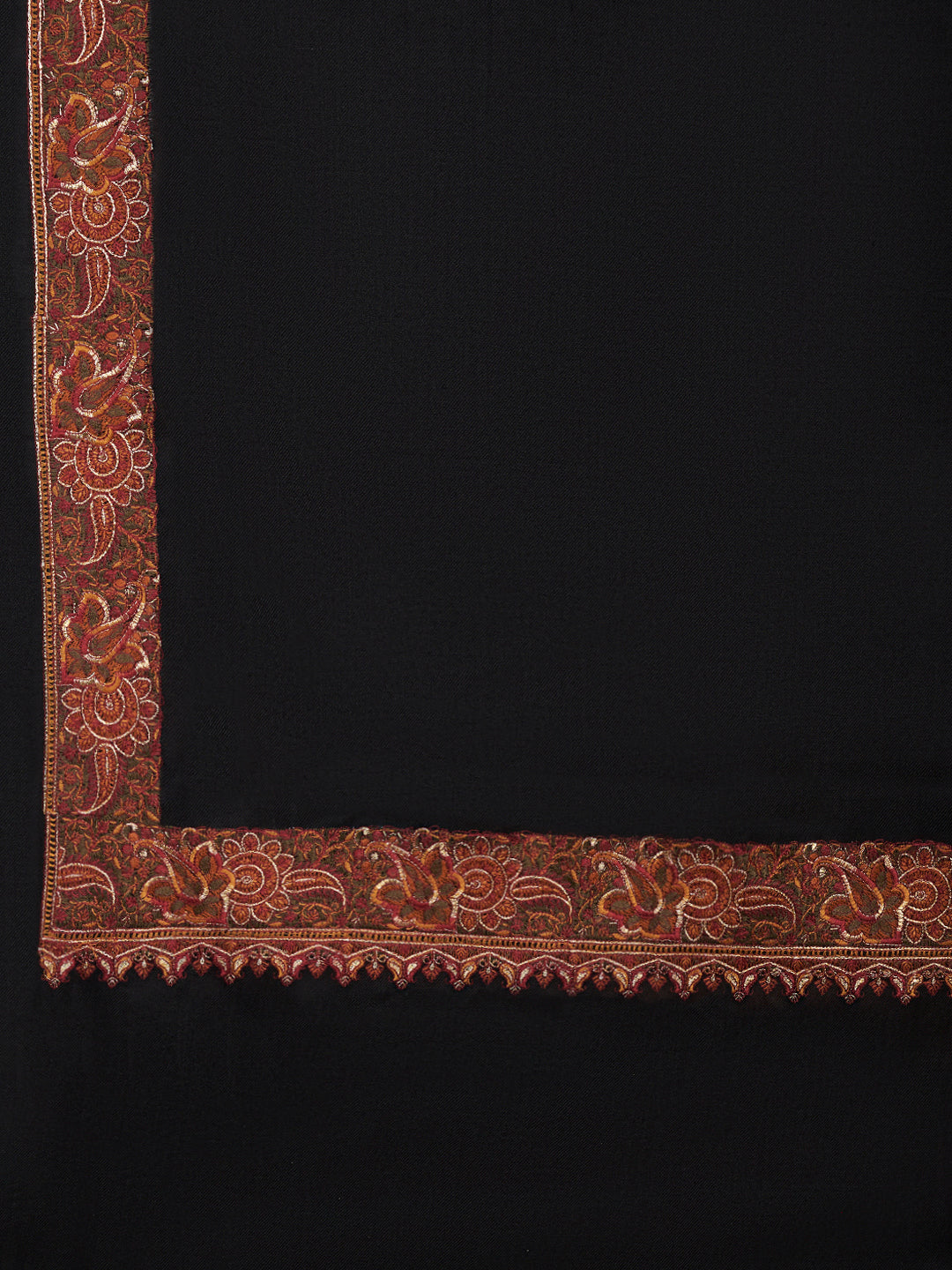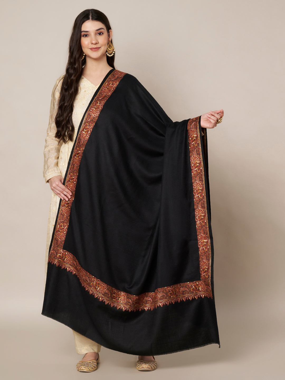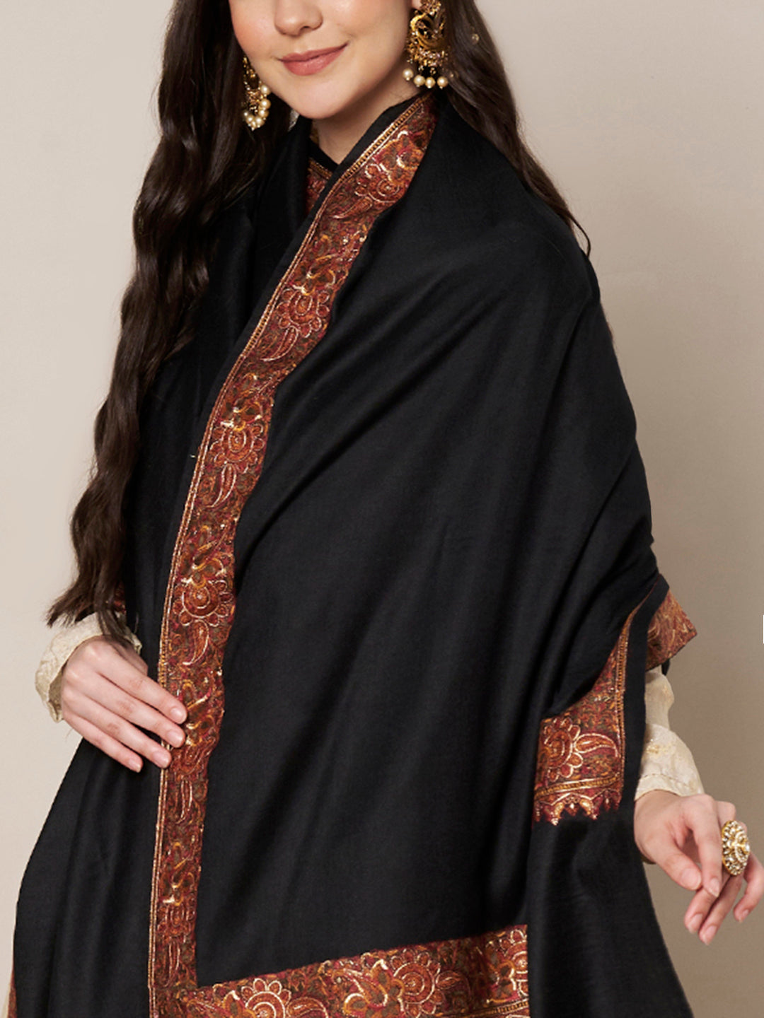 Woolen Women Shawl in Black with Embroidered Traditional Border (80 x 40 Inches)