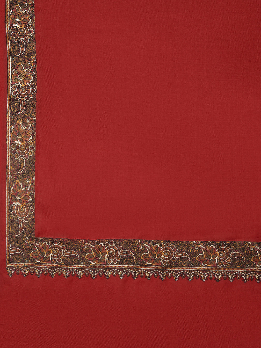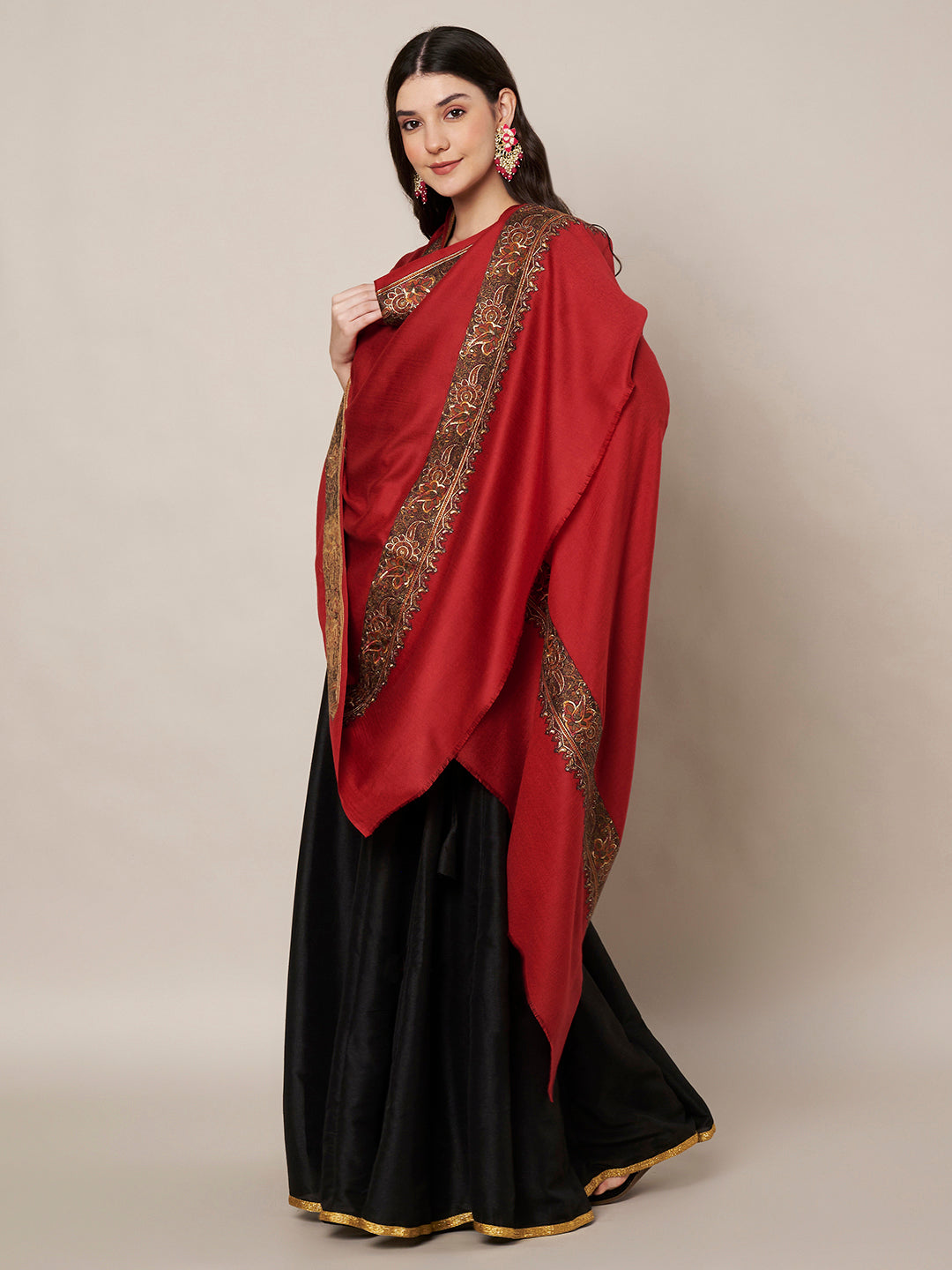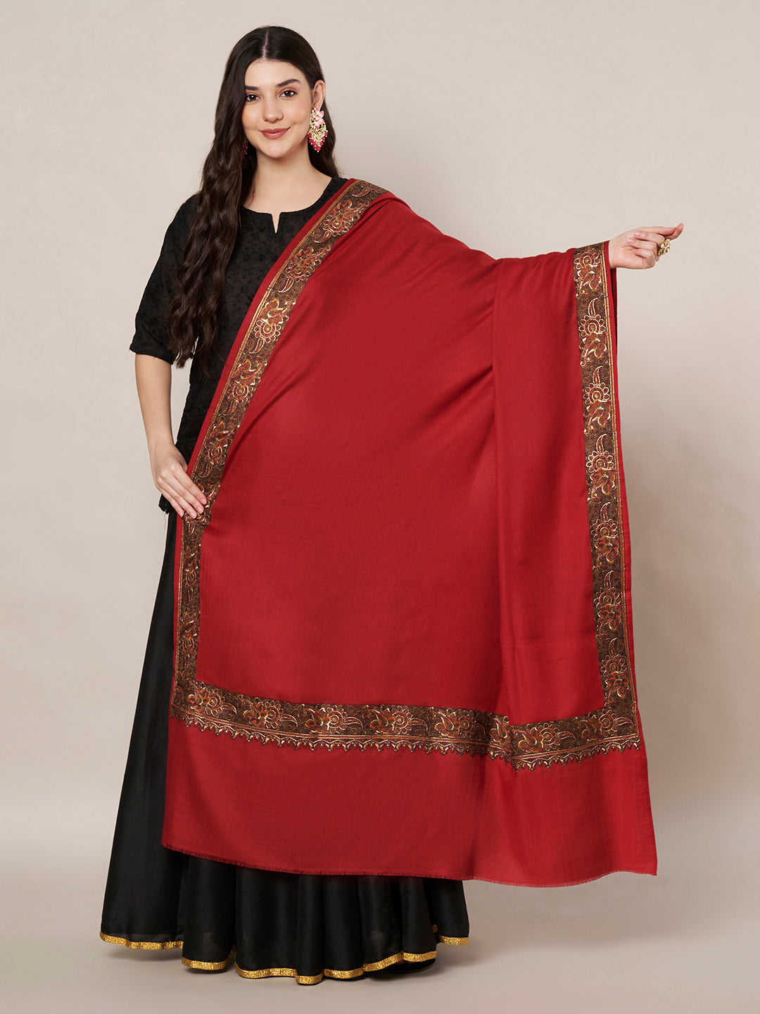Woolen Women Shawl in Deep Maroon with Embroidered Traditional Border (80 x 40 Inches)