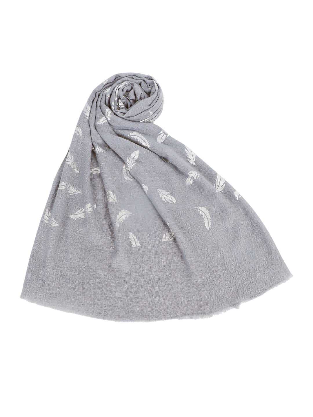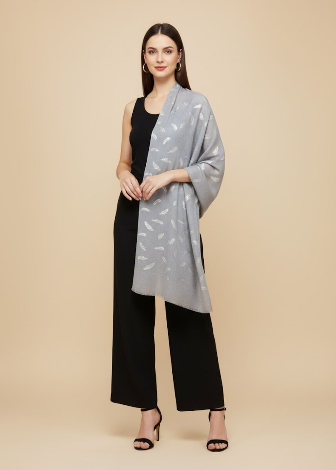 Micro Wool Grey Feather Motif Women Stole | Soft Wrap with Subtle Woven Accents (80 × 28 Inches)