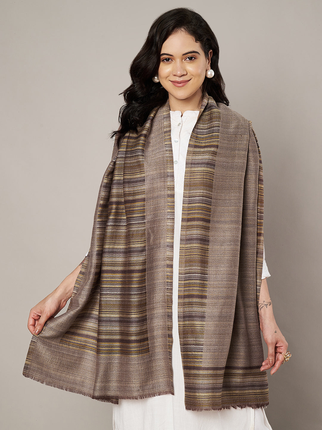 Add timeless versatility to your winter wardrobe with this elegant women’s woolen stole, crafted to combine warmth, comfort, and refined styling. Made from soft wool fabric, it offers a smooth, cozy feel with a graceful drape that sits beautifully on the shoulders. The stole features an all-over fine striped weave, lending it a classic and elongated look, while its reversible design allows two subtle styling variations in one piece for added practicality. Neatly finished edges enhance its clean, polished appearance, making it suitable for both everyday wear and elevated occasions. Measuring 80 × 28 inches, this stole can be styled effortlessly over kurtas, suits, sarees, dresses, and winter layers, making it ideal for winters, office wear, festive gatherings, travel, and casual outings—perfect for women who appreciate understated elegance and functional design.