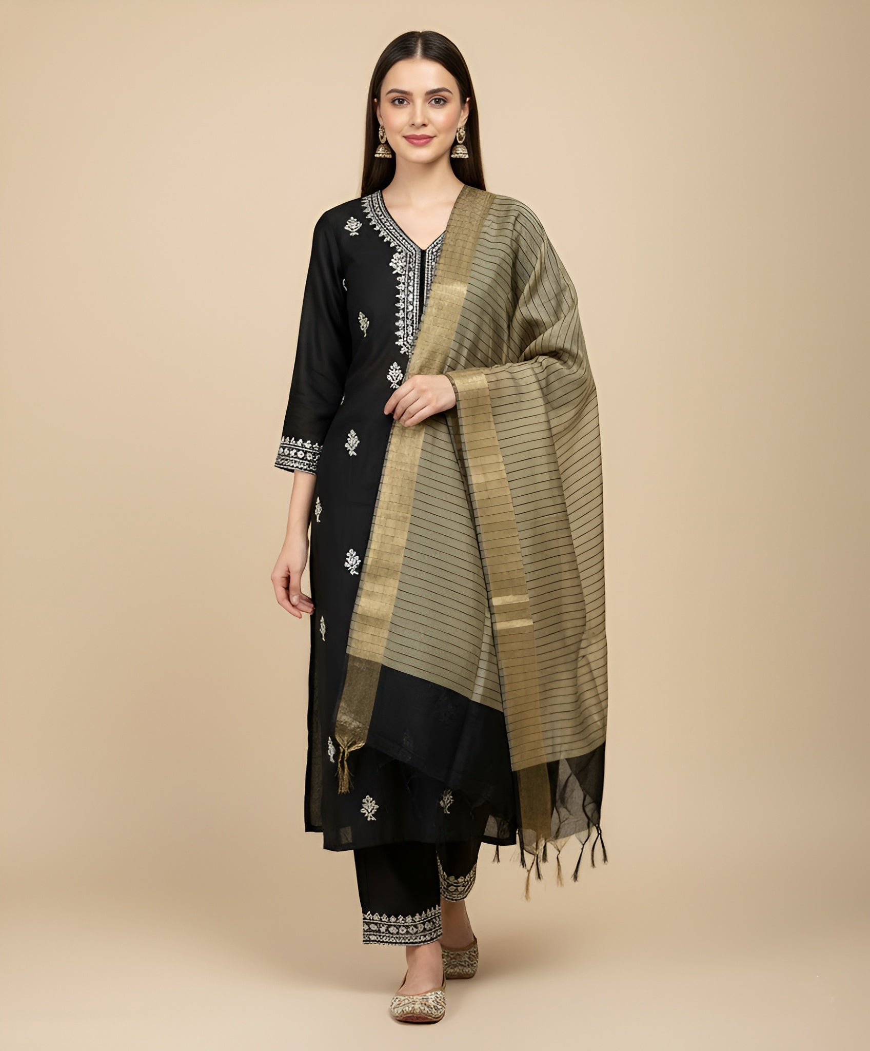 Designed to elevate ethnic ensembles with refined elegance, this women’s silk dupatta features a graceful striped weave that adds depth and a naturally elongated look to the drape. Crafted from smooth, lightweight silk, it offers a soft feel with a fluid fall that sits beautifully over the shoulders. The dupatta is highlighted with a subtle zari-accented border, lending it a touch of traditional sophistication while keeping the overall look balanced and versatile. Delicately finished edges with tassel detailing enhance its artisanal appeal and polished finish. Measuring approximately 2.5 metres, this dupatta pairs effortlessly with kurtas, suits, and festive outfits, making it ideal for daily ethnic wear, office styling, celebrations, and elegant occasions—perfect for women who appreciate classic patterns with timeless charm.