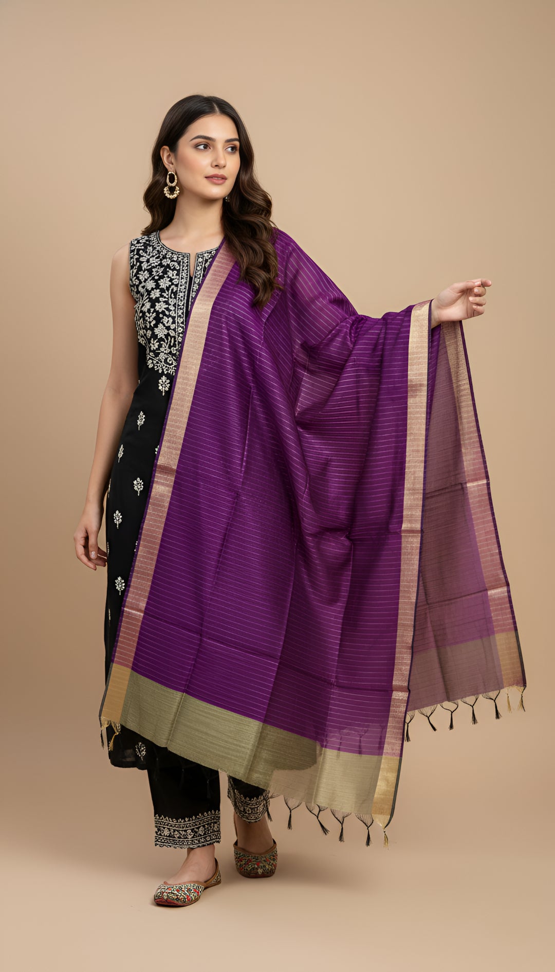 Designed to elevate ethnic ensembles with refined elegance, this women’s silk dupatta features a graceful striped weave that adds depth and a naturally elongated look to the drape. Crafted from smooth, lightweight silk, it offers a soft feel with a fluid fall that sits beautifully over the shoulders. The dupatta is highlighted with a subtle zari-accented border, lending it a touch of traditional sophistication while keeping the overall look balanced and versatile. Delicately finished edges with tassel detailing enhance its artisanal appeal and polished finish. Measuring approximately 2.5 metres, this dupatta pairs effortlessly with kurtas, suits, and festive outfits, making it ideal for daily ethnic wear, office styling, celebrations, and elegant occasions—perfect for women who appreciate classic patterns with timeless charm.