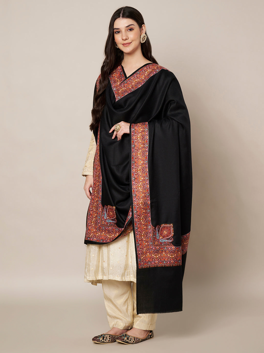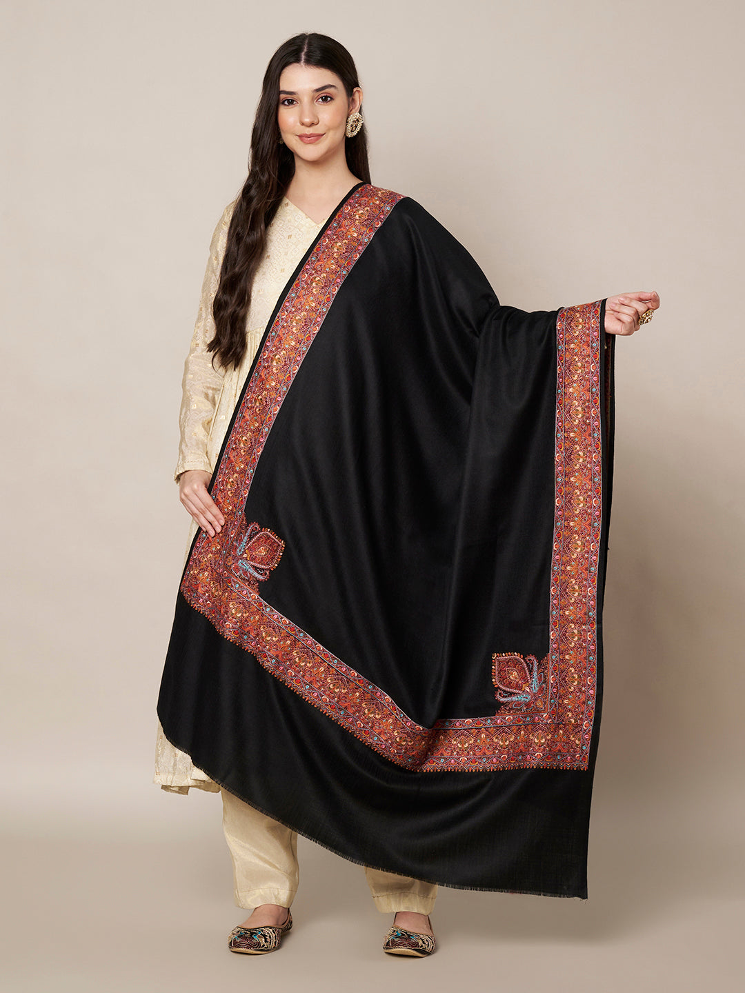 The shawl is beautifully highlighted with a richly detailed multicolour embroidered border, inspired by traditional Kashmiri and paisley motifs. Intricate floral patterns along the edges and accent corner motifs add depth, heritage charm, and visual richness while maintaining a balanced and elegant aesthetic.