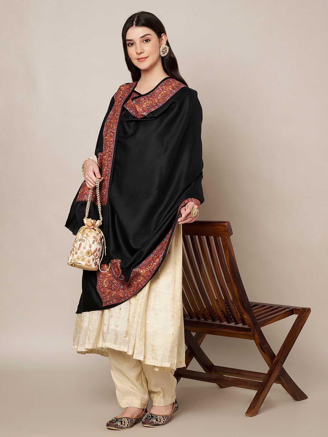Woolen Women Shawl in Black with Multicolour Kashmiri-Inspired Embroidered Border (80 x 40 Inches)