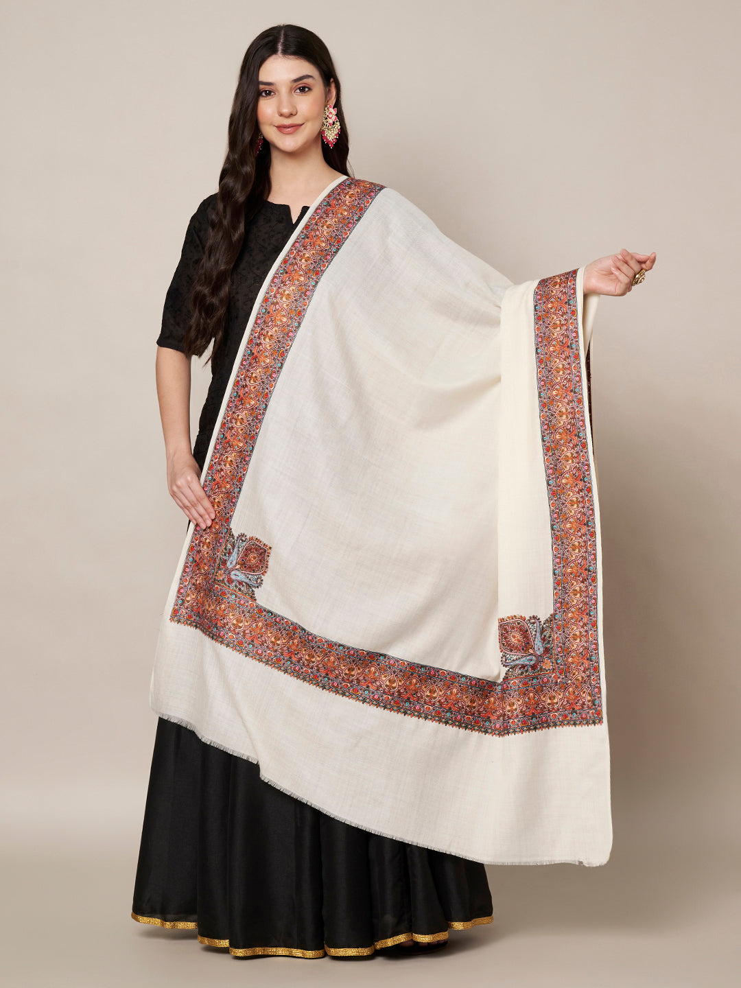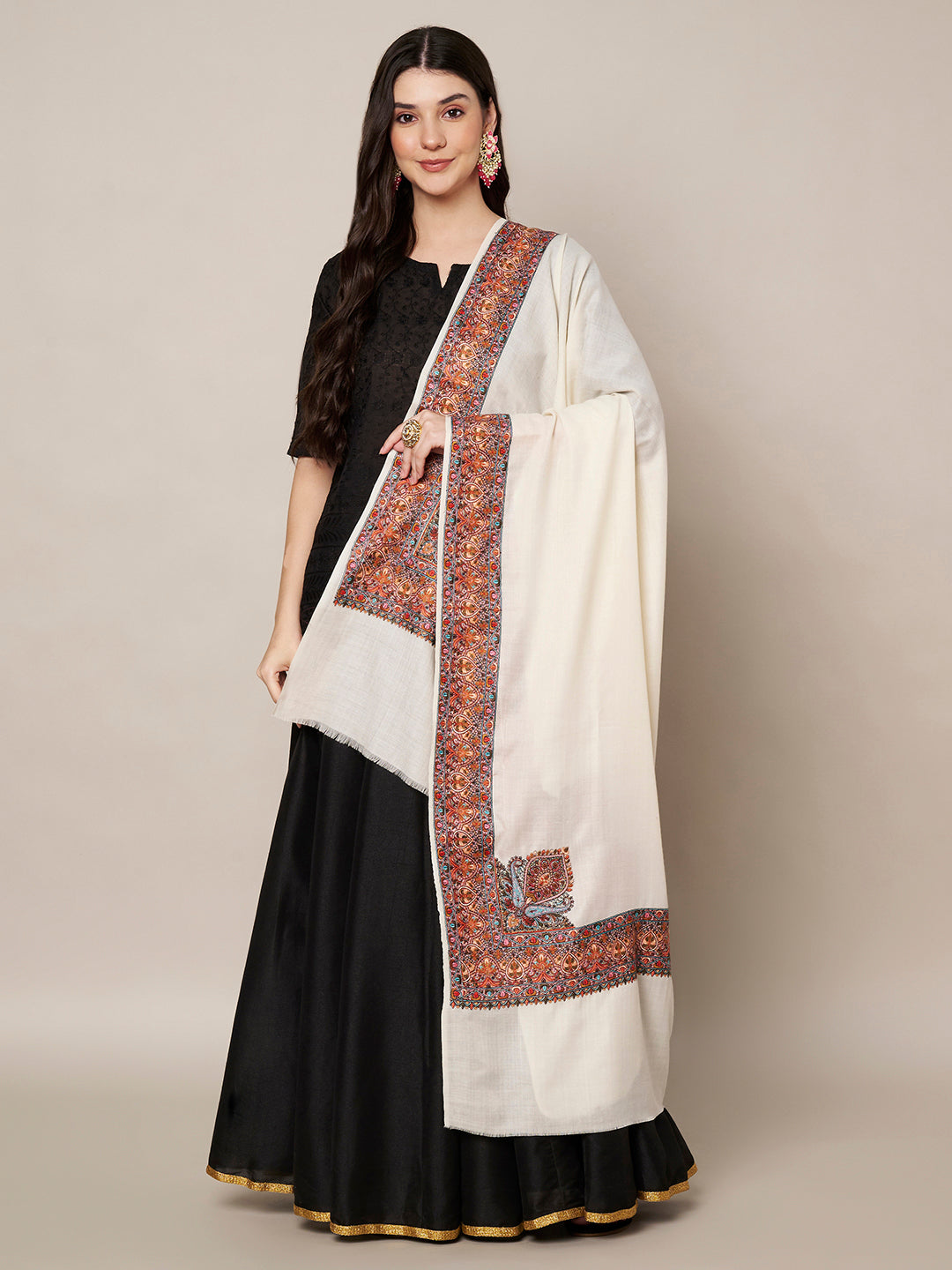 Woolen Women Shawl in Ivory with Multicolour Kashmiri-Inspired Embroidered Border (80 x 40 Inches)