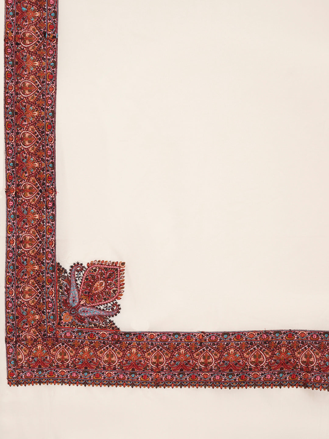 The shawl is beautifully highlighted with a richly detailed multicolour embroidered border, inspired by traditional Kashmiri and paisley motifs. Intricate floral patterns along the edges and accent corner motifs add depth, heritage charm, and visual richness while maintaining a balanced and elegant aesthetic.