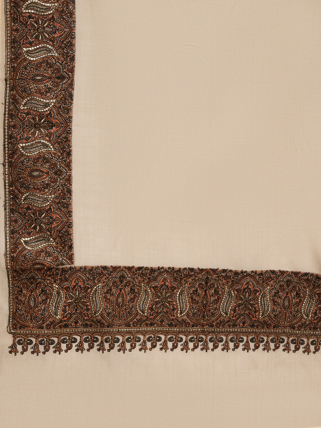 The shawl is highlighted with a richly detailed embroidered border featuring traditional paisley and ornamental motifs in contrasting hues. The intricate craftsmanship along the edges adds depth and heritage appeal, elevating the overall look while maintaining a balanced and elegant aesthetic.