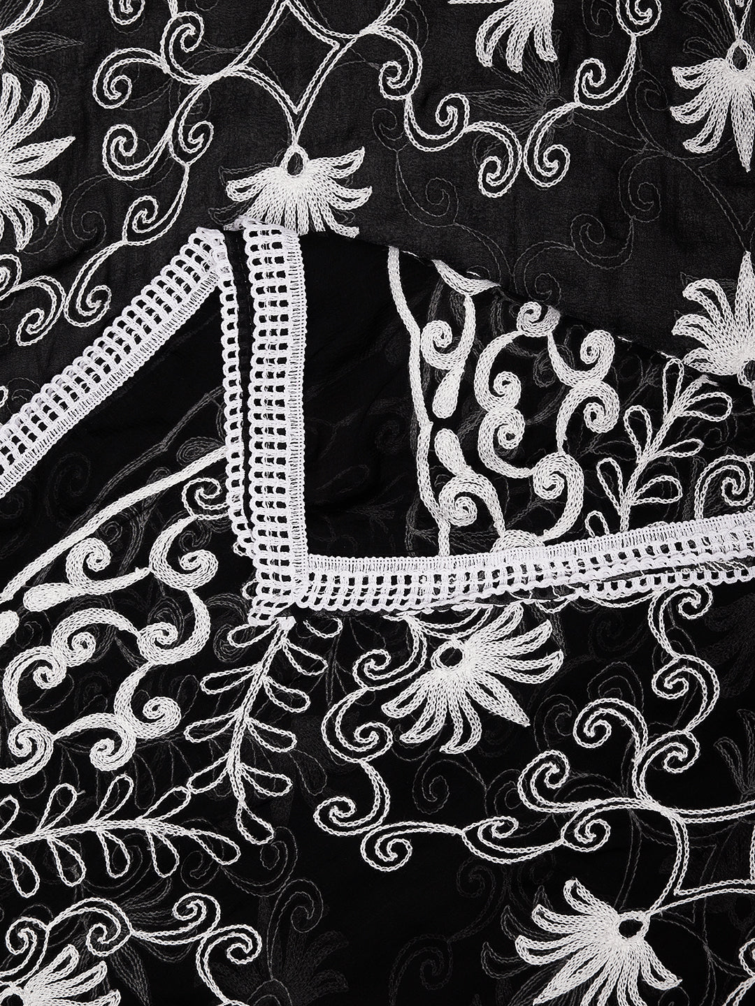 This graceful black Karachi chiffon dupatta is beautifully adorned with intricate all-over thread embroidery that creates a soft, airy, and refined look. Crafted from lightweight chiffon, it offers a fluid drape and a sheer finish that adds effortless elegance to any ethnic outfit. The delicate floral and vine motifs enhance its feminine charm, while the subtle lace-trimmed edges complete the design with a polished touch. Ideal to pair with solid or contrasting kurtas, this dupatta is perfect for festive occasions, evening gatherings, and elegant everyday wear.