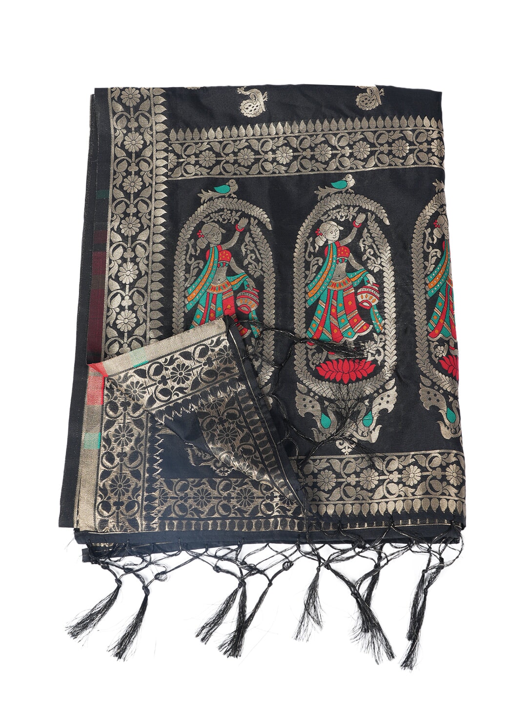 Black Paithani Silk Dupatta with Traditional Peacock Motifs (Size: 2.5x1 m Approx)