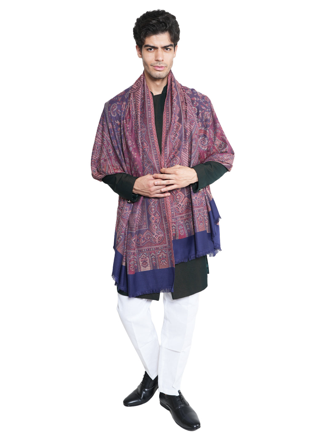 The rich blue tone, complemented by intricate woven detailing and a contrasting border, adds depth and sophistication to the overall look. Lightweight yet insulating, it drapes comfortably over the shoulders without feeling bulky. Finished with neat fringed edges, it delivers a polished and dignified finish.