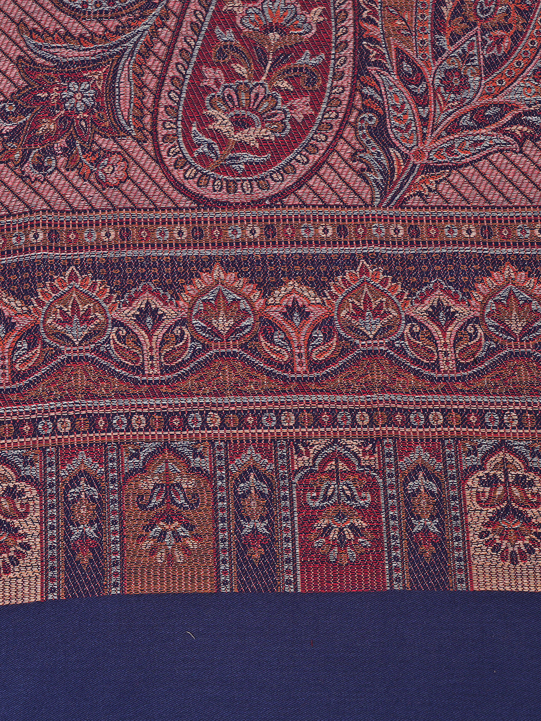 The deep blue base is accentuated with subtle woven motifs and a contrasting solid border, adding depth and richness to the overall look. Finished with delicate fringed edges, this shawl drapes gracefully and offers a luxurious feel without being heavy.