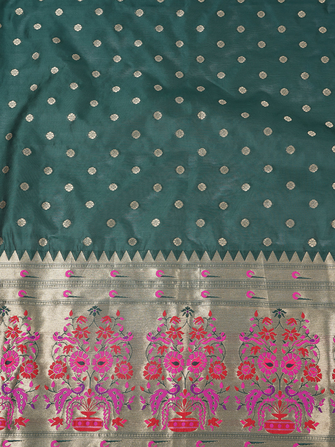 Bottle Green Paithani Silk Dupatta with Gold Zari Butti & Traditional Border (Size: 2.5x1 m Approx)