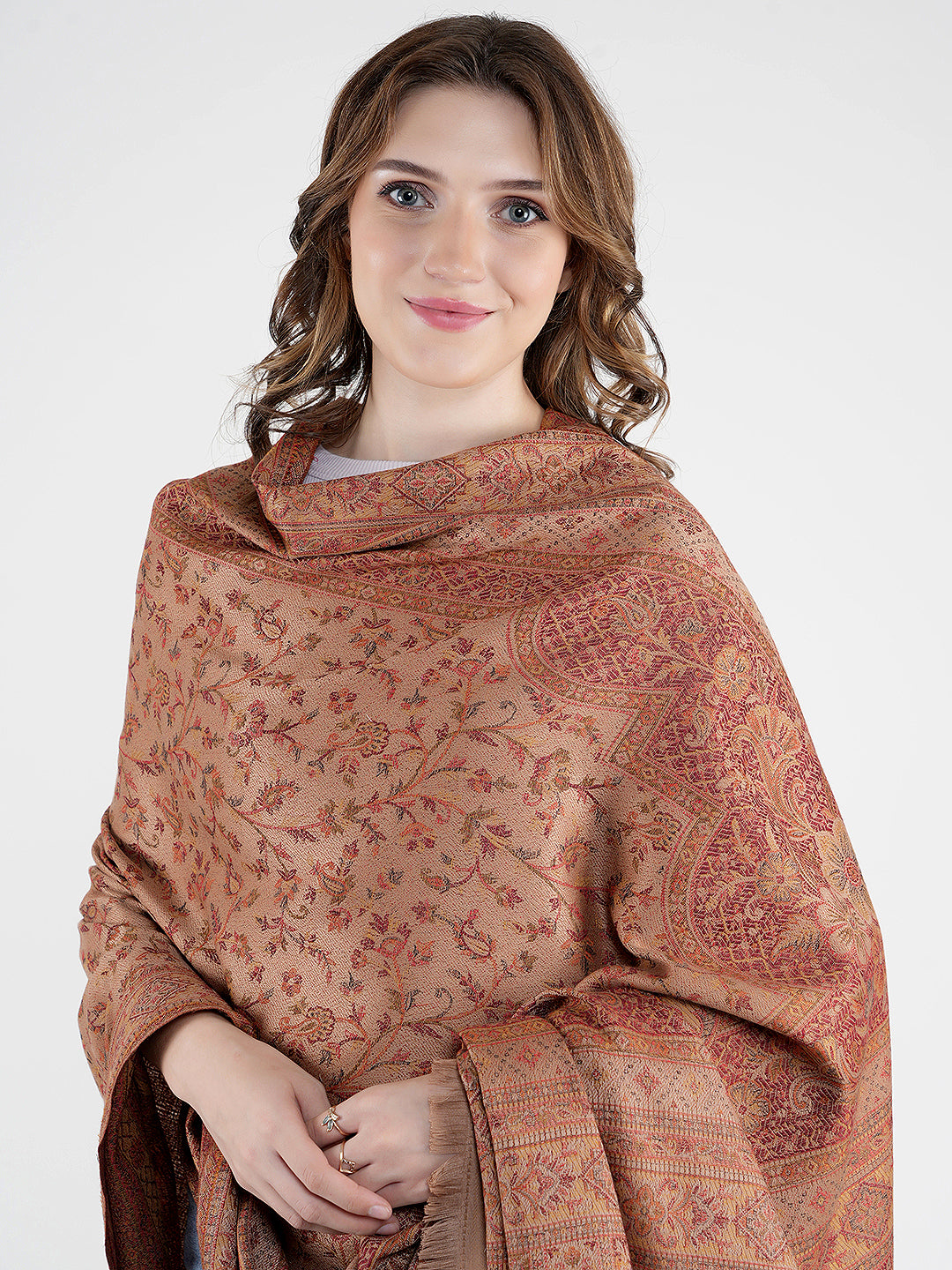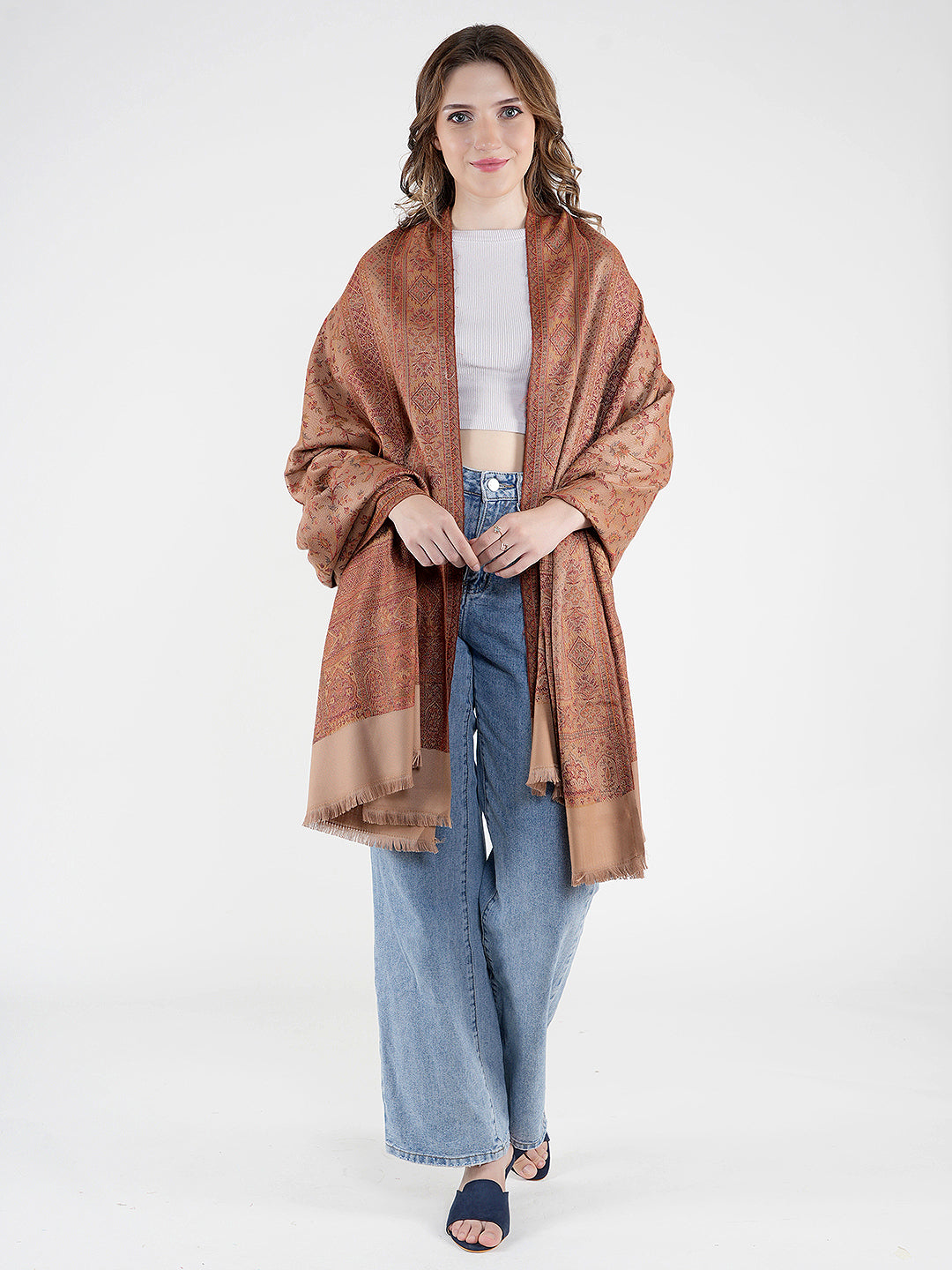 The deep brown base is accentuated with subtle woven motifs and a contrasting solid border, adding depth and richness to the overall look. Finished with delicate fringed edges, this shawl drapes gracefully and offers a luxurious feel without being heavy.
