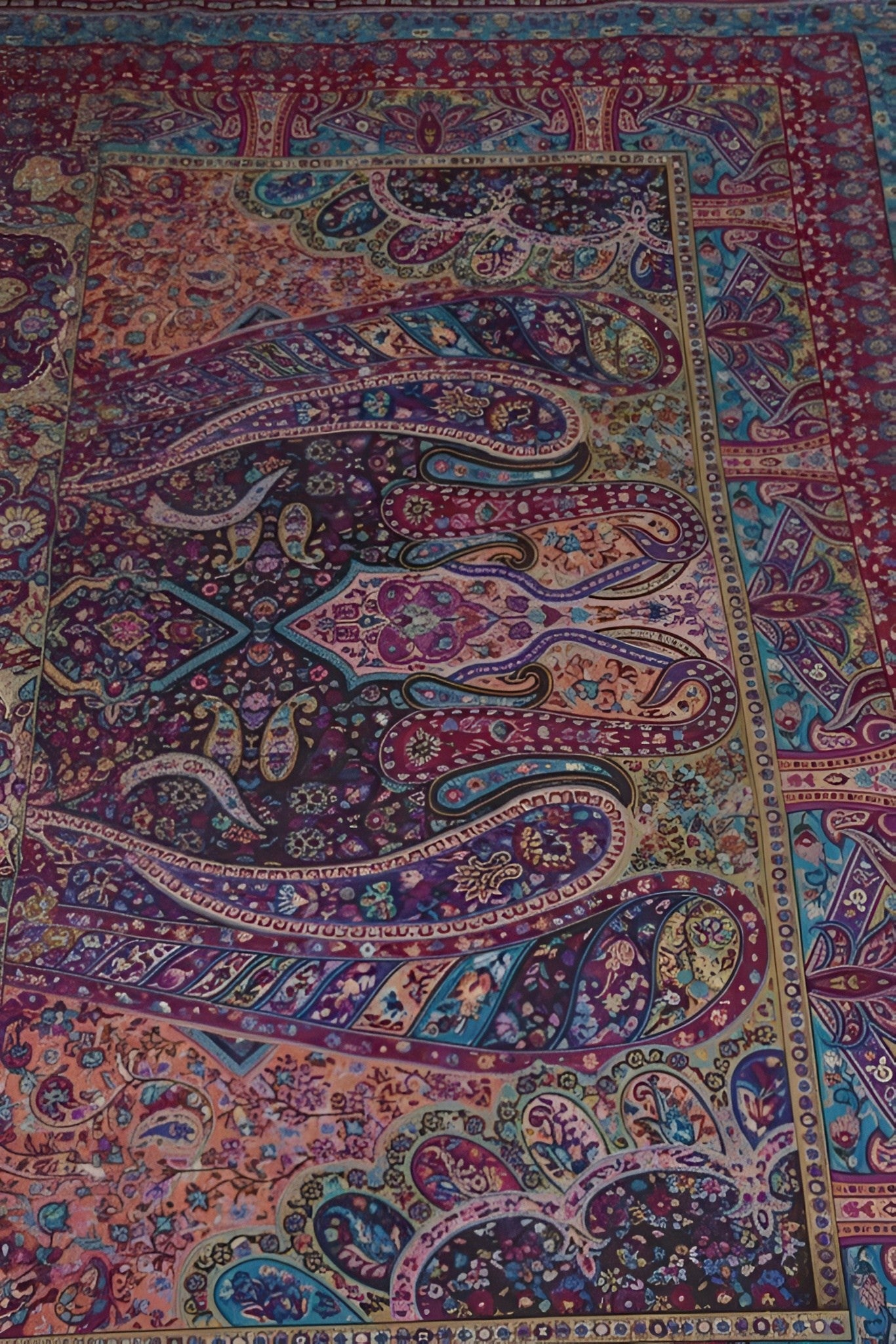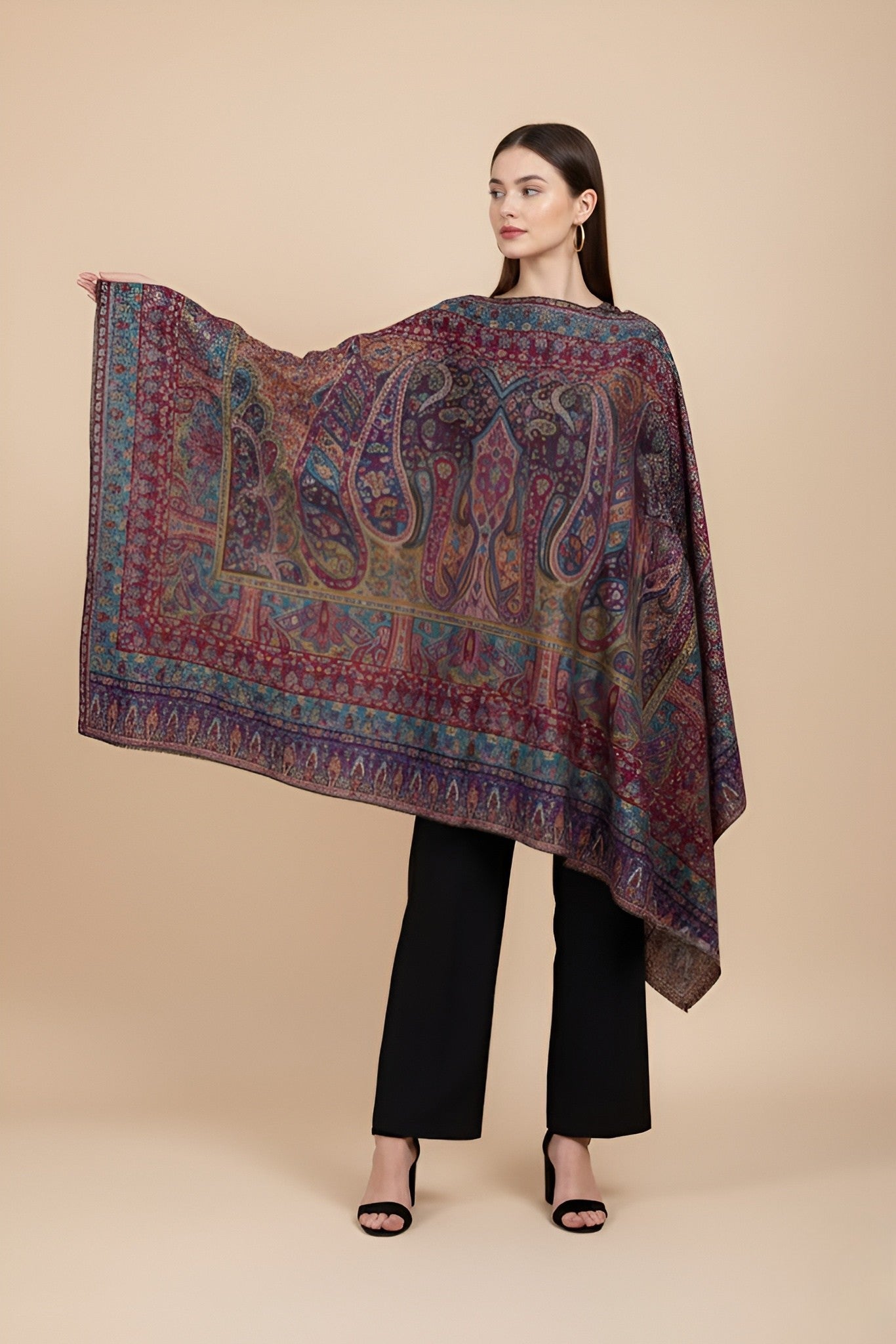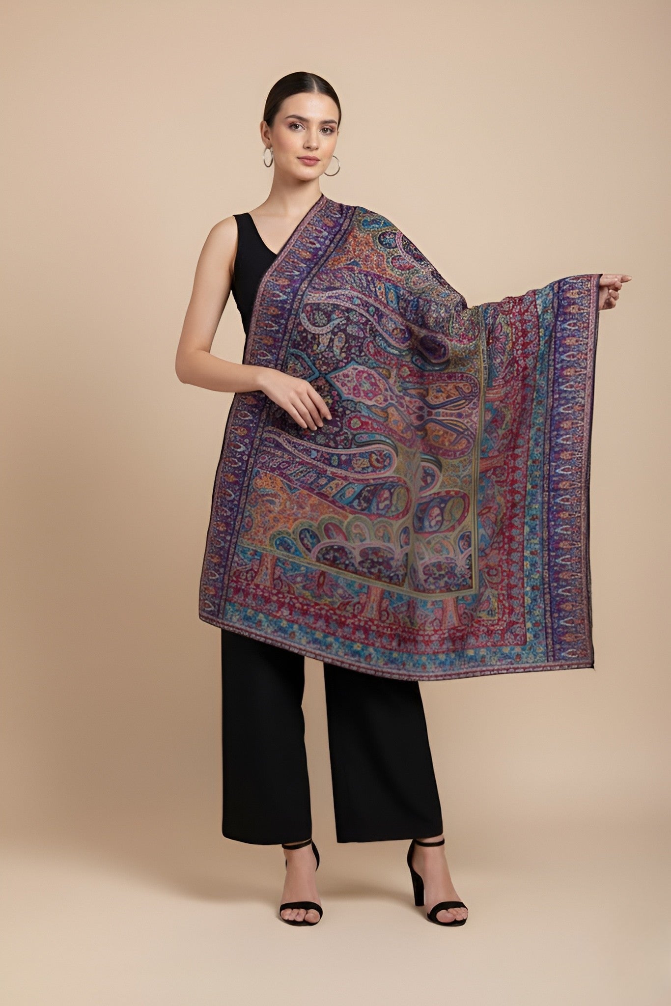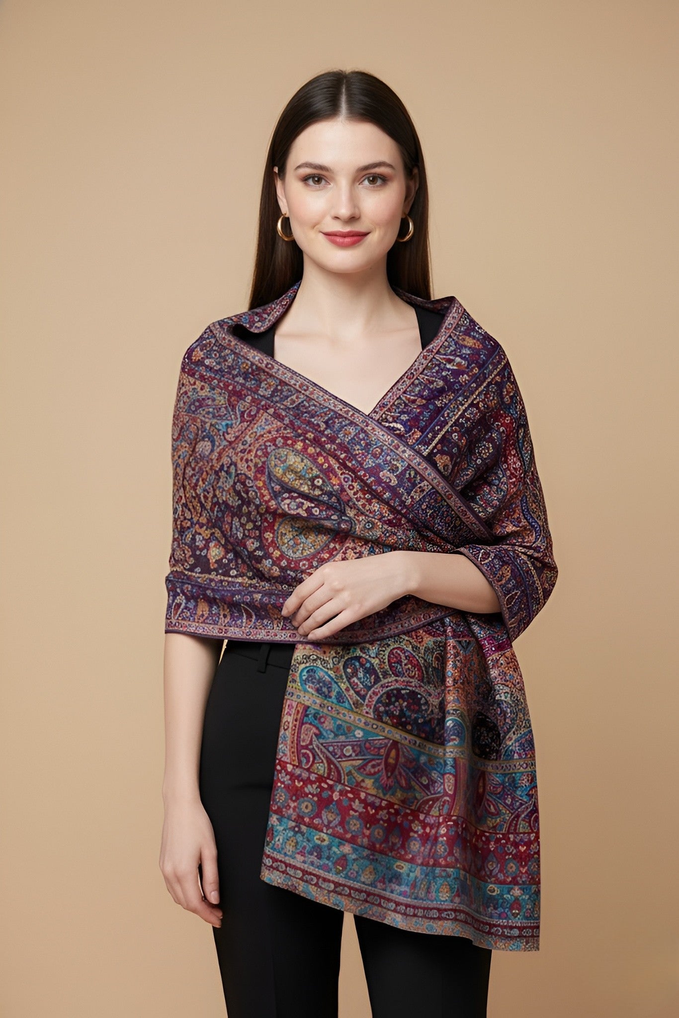This women’s shawl is beautifully crafted from luxurious bamboo silk, offering a soft, fluid drape with a subtle natural sheen. Featuring intricate Kani-inspired patterns, the shawl showcases a harmonious blend of multiple tones, creating a graceful and artistic appeal.