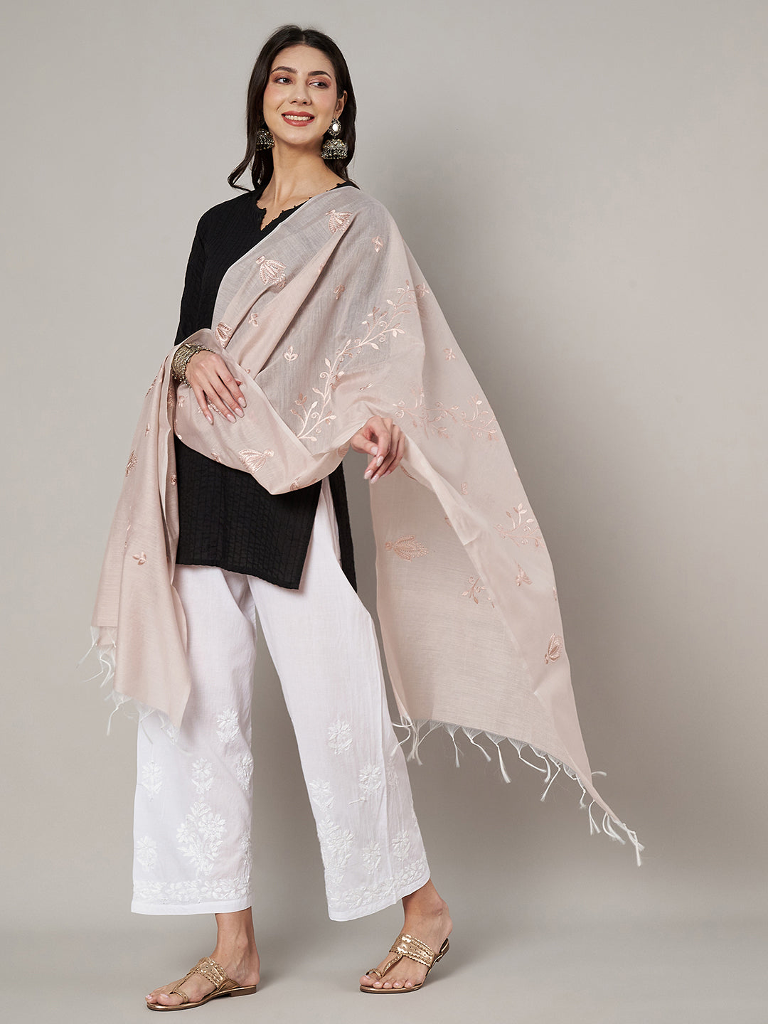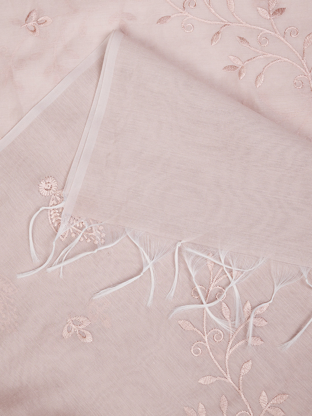 This elegant pink Chanderi cotton dupatta showcases delicate floral embroidery scattered gracefully across the fabric, lending it a soft, handcrafted appeal. Crafted in lightweight Chanderi cotton, it offers a breathable, airy drape with a gentle sheen that enhances its understated charm. The tonal embroidery and fine detailing create a refined look, while the minimal border and soft tassels keep it effortlessly elegant. Perfect to pair with whites, pastels, or earthy tones, this dupatta is ideal for daytime festivities, festive gatherings, and sophisticated everyday ethnic wear.