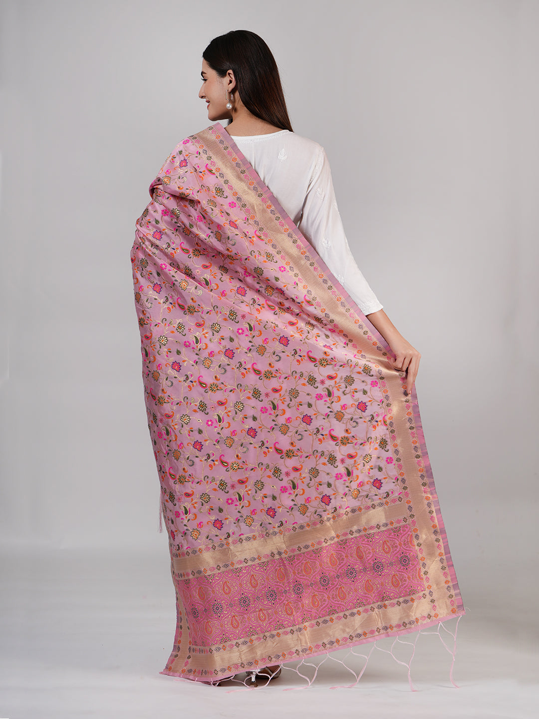 Pink Kashmiri Silk Dupatta with Multicolour Floral Vine Weave & Zari Border (Size: 2.5x1 m Approx)