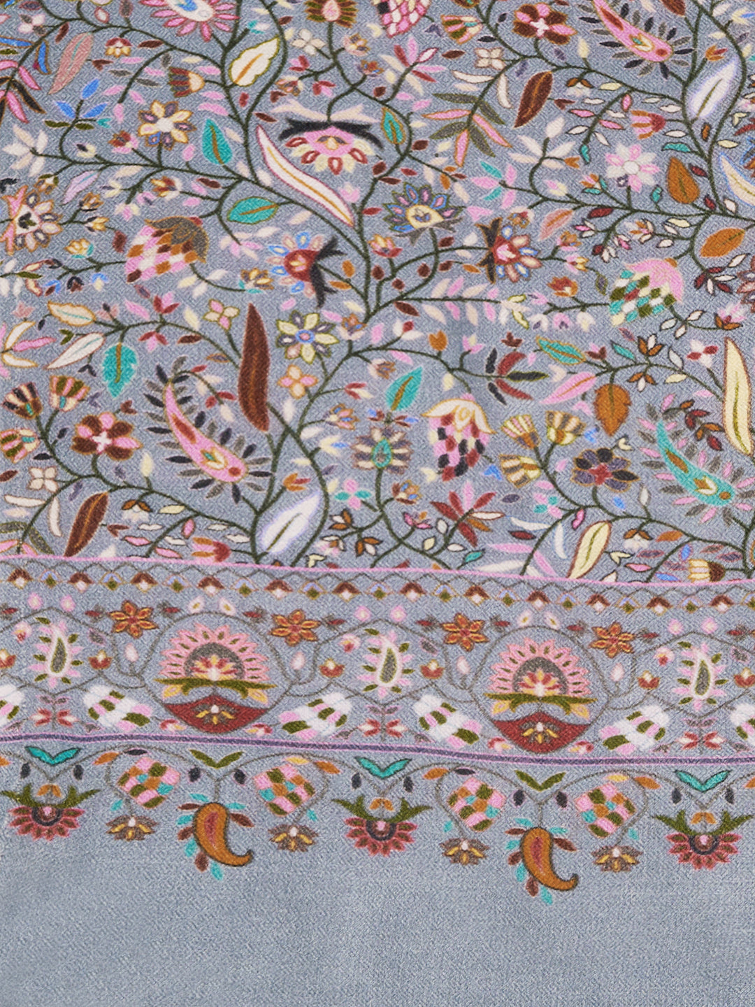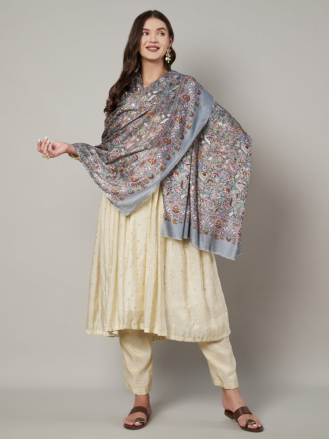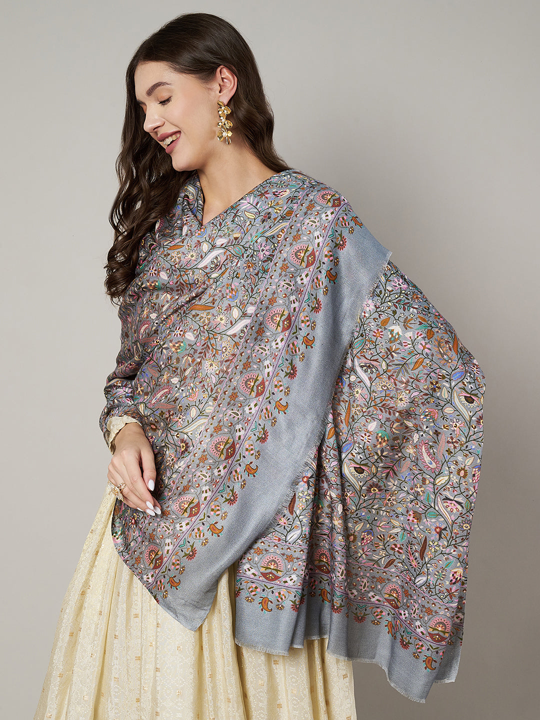 This women’s shawl is made from luxurious bamboo silk, offering a smooth texture, soft sheen, and an elegant, fluid drape. The shawl features a rich grey base adorned with intricate all-over floral and vine-inspired prints in multicolour tones, giving it a vibrant yet refined look. A beautifully defined printed border adds depth and enhances its traditional appeal.