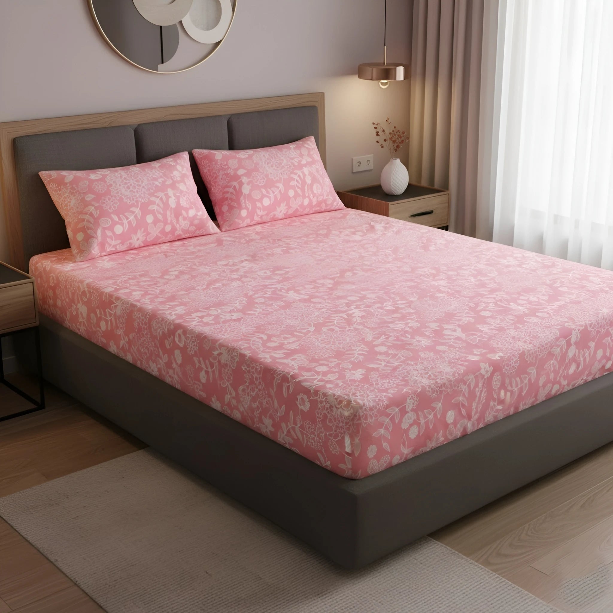 Refresh your bedroom with this queen size elastic fitted bedsheet set, designed to fit a 72 × 78 inch mattress perfectly. Crafted from premium glace cotton, it offers a soft, smooth texture with a gentle sheen and breathable comfort for all-season use. The 210 thread count fabric ensures lasting durability while maintaining a lightweight and comfortable feel. Featuring an elegant all-over floral print, it enhances the aesthetic of both contemporary and classic interiors. The fully elasticated edges provide a secure, wrinkle-free fit that stays neatly in place. This set includes 1 fitted bedsheet and 2 matching pillow covers, making it a complete and practical bedding solution for everyday comfort with refined style.