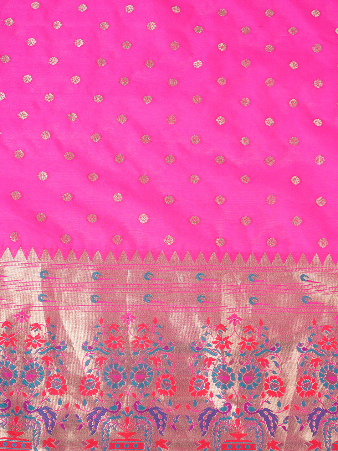 Crafted in premium silk, this Paithani dupatta features a rich rani base adorned with classic gold zari polka butti motifs and a beautifully detailed traditional Paithani border highlighted with floral patterns. The lustrous silk fabric offers a soft, graceful drape, while the ornate zari pallu and subtle tassel finish add a regal touch, making it perfect for festive occasions, weddings, and elegant ethnic styling. Pair it with solid kurtas or traditional ensembles to create a timeless statement look. Material: Silk | Size: Approx. 2.5 x 1 metres.