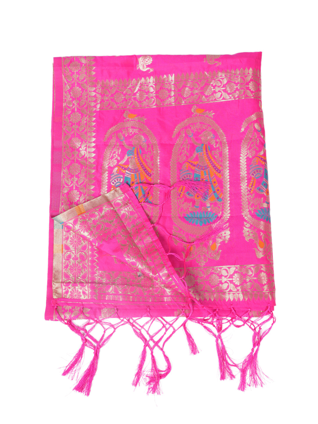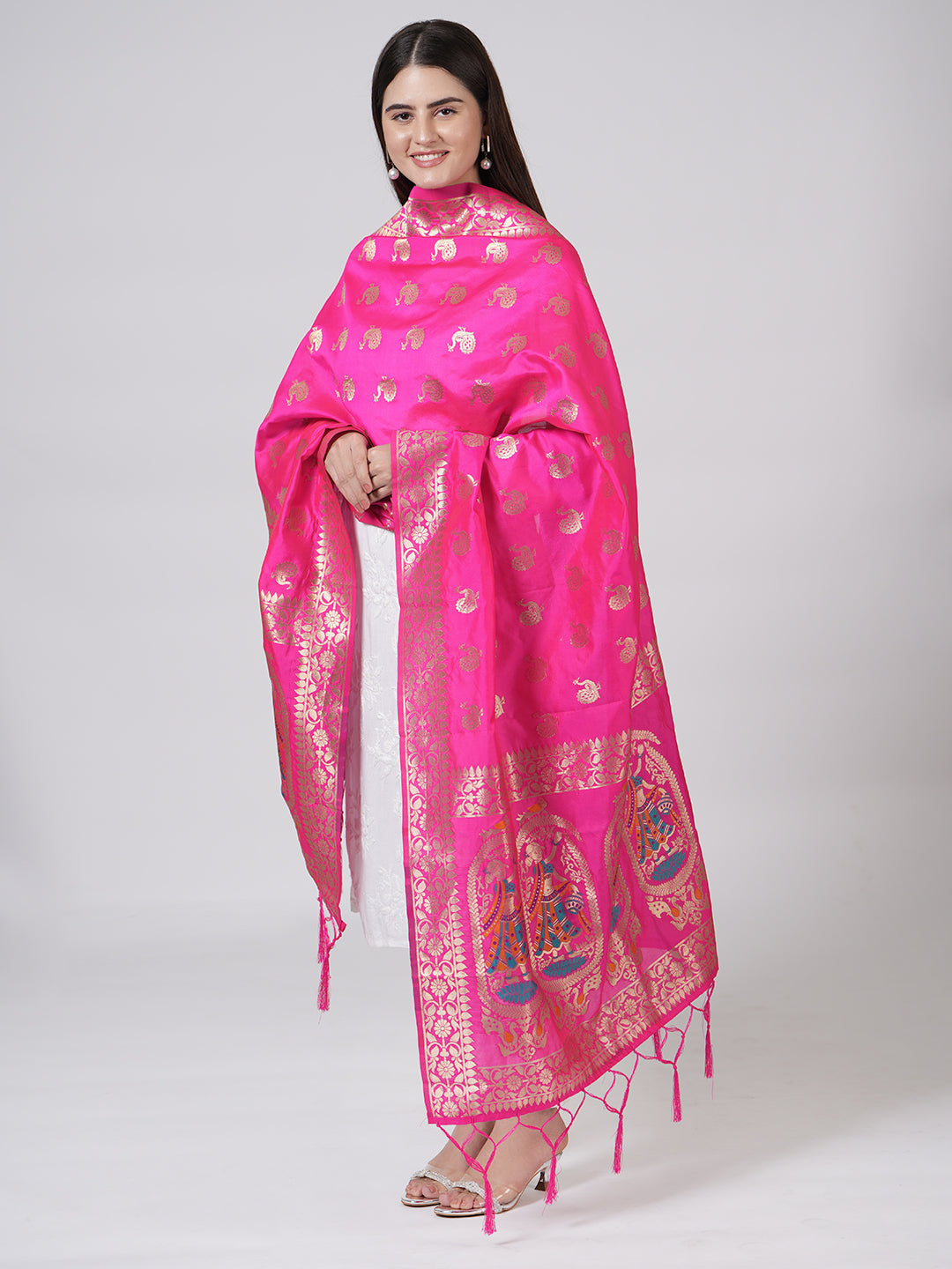 Crafted in luxurious silk, this Paithani-inspired dupatta showcases a rich rani base highlighted with traditional peacock and floral motifs and an elegant gold zari woven border, reflecting timeless Indian craftsmanship. The smooth, lustrous silk offers a graceful fall and premium feel, making it ideal for festive occasions, weddings, and cultural celebrations. Finished with delicate tassels for a refined touch, this dupatta pairs beautifully with solid kurtas, anarkalis, or lehengas to elevate any ethnic ensemble. Material: Silk | Size: Approx. 2.5 x 1 metres.