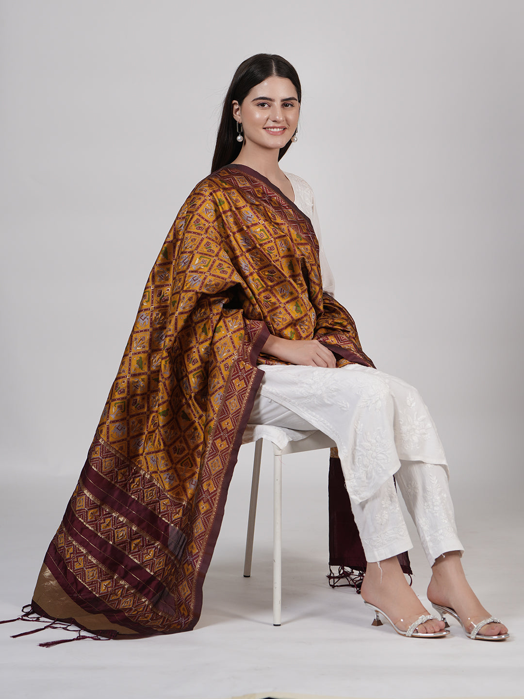 Crafted in rich silk, this striking Paithani dupatta features a vibrant royal mustard base intricately woven with traditional geometric motifs highlighted in contrasting hues, reflecting classic Paithani artistry with a bold, contemporary appeal. Accentuated by a contrast red and gold zari border with a detailed pallu, the dupatta offers a perfect balance of heritage charm and festive elegance. The smooth, lustrous silk drapes beautifully, making it an ideal choice for weddings, festive occasions, and statement ethnic looks. Pair it with solid kurtas or traditional ensembles to let its vibrant craftsmanship stand out. Material: Silk | Size: Approx. 2.5 x 1 metres.