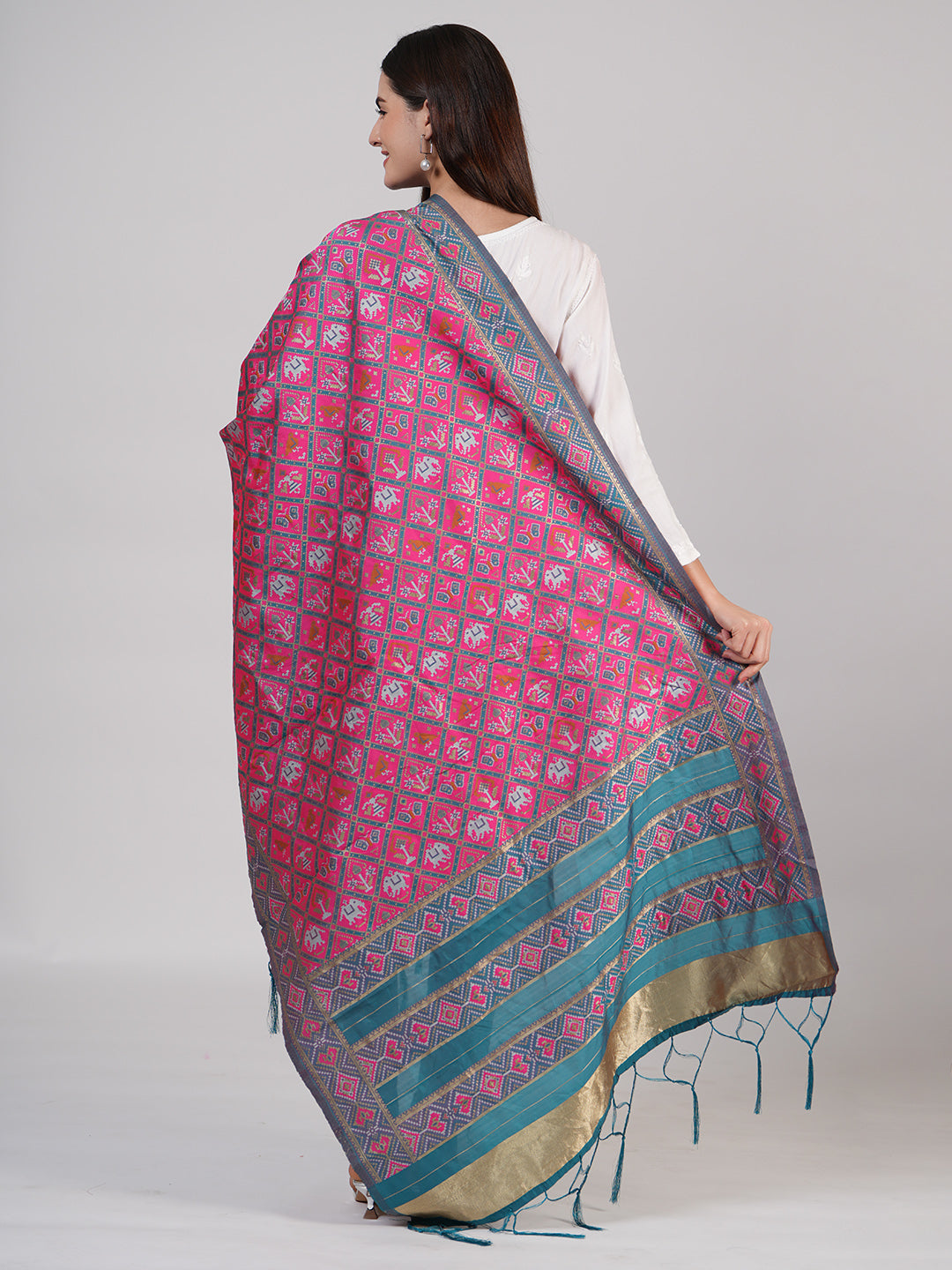 Crafted in rich silk, this striking Paithani dupatta features a vibrant royal pink base intricately woven with traditional geometric motifs highlighted in contrasting hues, reflecting classic Paithani artistry with a bold, contemporary appeal. Accentuated by a contrast red and gold zari border with a detailed pallu, the dupatta offers a perfect balance of heritage charm and festive elegance. The smooth, lustrous silk drapes beautifully, making it an ideal choice for weddings, festive occasions, and statement ethnic looks. Pair it with solid kurtas or traditional ensembles to let its vibrant craftsmanship stand out. Material: Silk | Size: Approx. 2.5 x 1 metres.