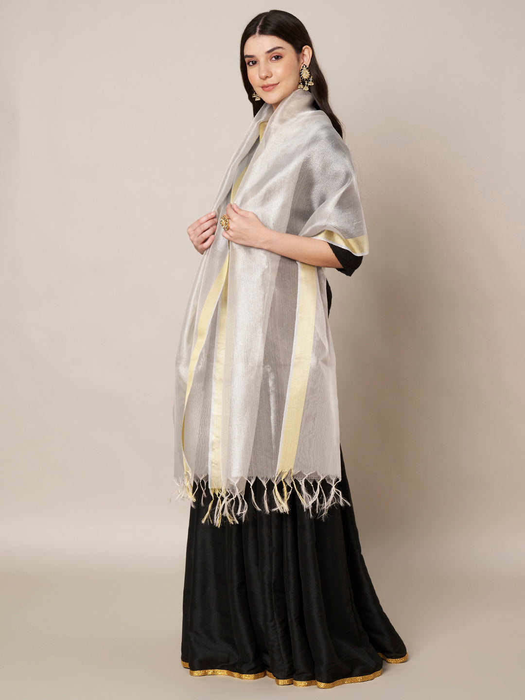 Elegant and understated, this cotton silk dupatta comes in a soft silver tone with a delicate woven texture that adds depth without overpowering the look. Crafted from a cotton silk blend, it offers a lightweight, breathable feel with a gentle sheen, making it comfortable for long wear. The clean border and fine finishing give it a refined appearance, while the fluid drape pairs beautifully with both embroidered and plain suits. Ideal for festive wear, day functions, poojas, and elegant everyday ethnic styling, this dupatta is a versatile wardrobe essential.