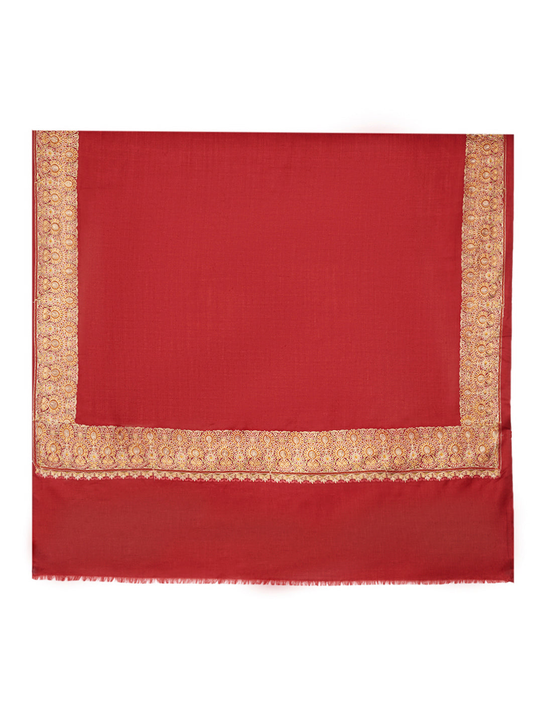 The standout feature of this shawl is its luxurious golden embroidered border, inspired by classic traditional motifs that add a regal and festive character. The rich contrast between the vibrant solid base and the ornate border enhances its statement appeal, making it suitable for formal and cultural occasions.