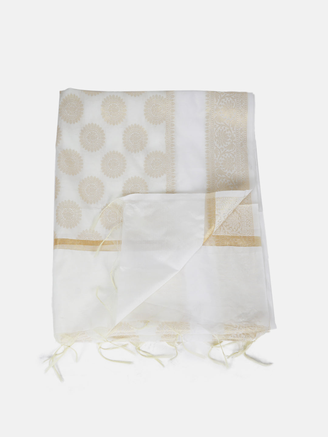 This graceful Banarasi dupatta is crafted from premium silk, featuring a rich white base highlighted with elegant all-over woven gold zari butti motifs that add a subtle festive shimmer. The design is enhanced with a classic Banarasi zari border and neatly finished edges, giving it a timeless and refined appeal. The smooth, lustrous silk drapes beautifully, making it an ideal choice for weddings, festive celebrations, poojas, and traditional occasions, pairing effortlessly with solid or contrast ethnic outfits. Material: Silk | Size: Approx. 2.5 x 1 metres.