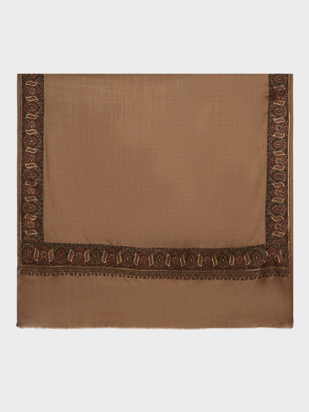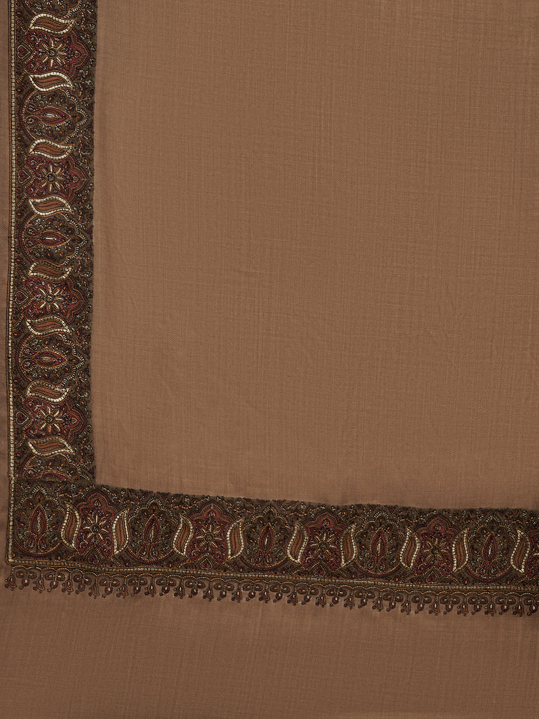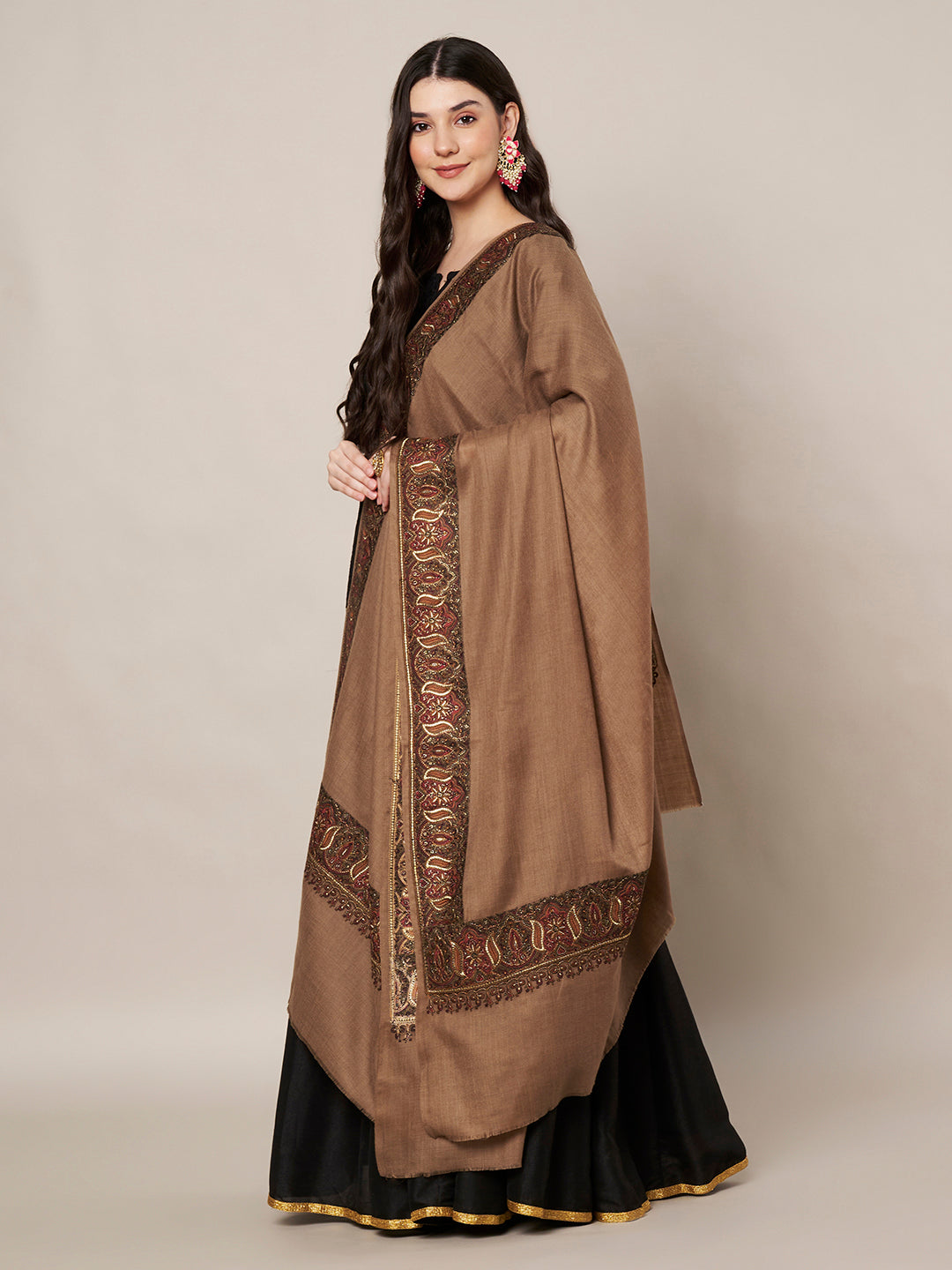 Woolen Women Shawl in Warm Mocha Brown with Intricate Traditional Embroidered Border (80 x 40 Inches)
