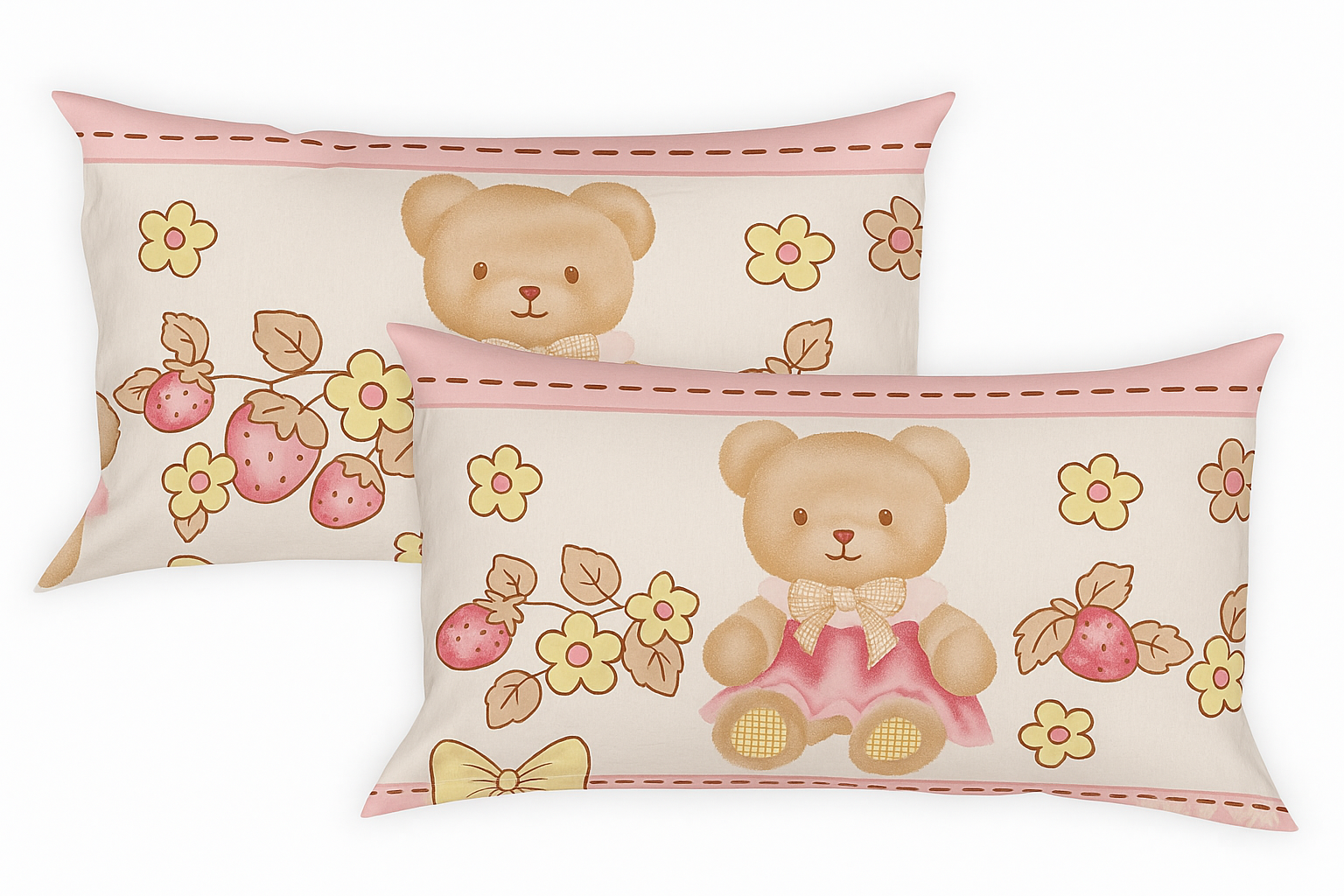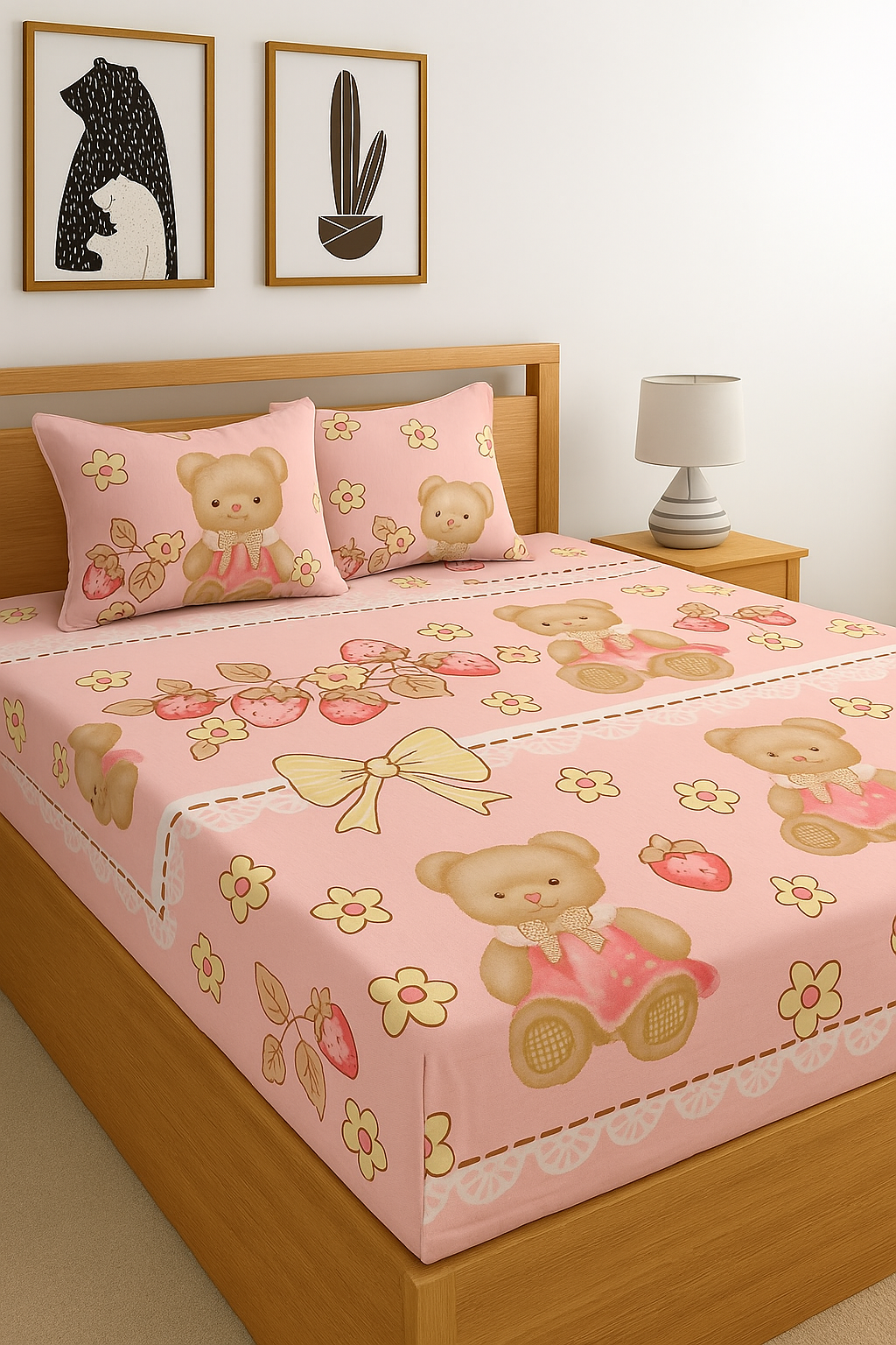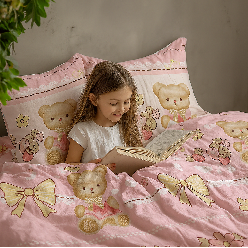 This set includes two matching pillow covers, each featuring the same teddy bear and bow design as the bedsheet. Together, they create a coordinated and picture-perfect look that transforms any kids’ bedroom into a delightful space.