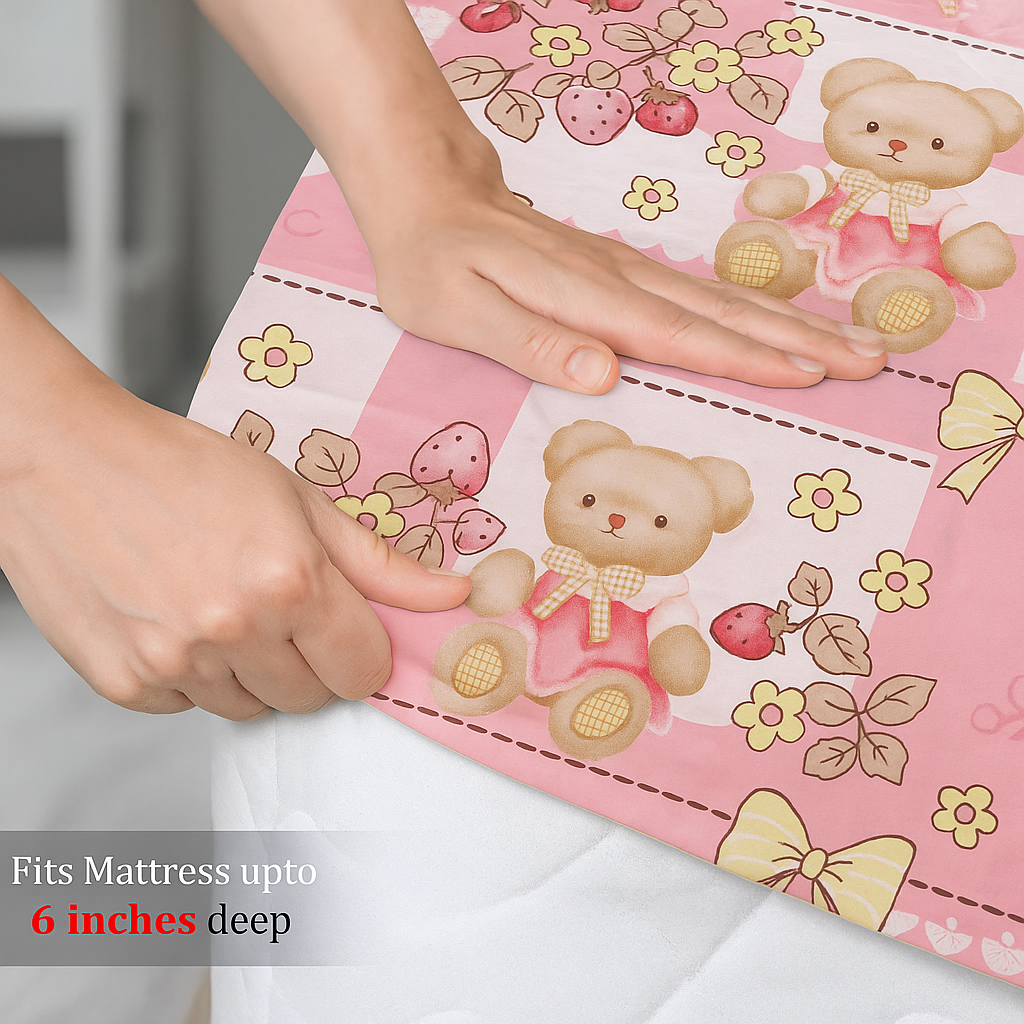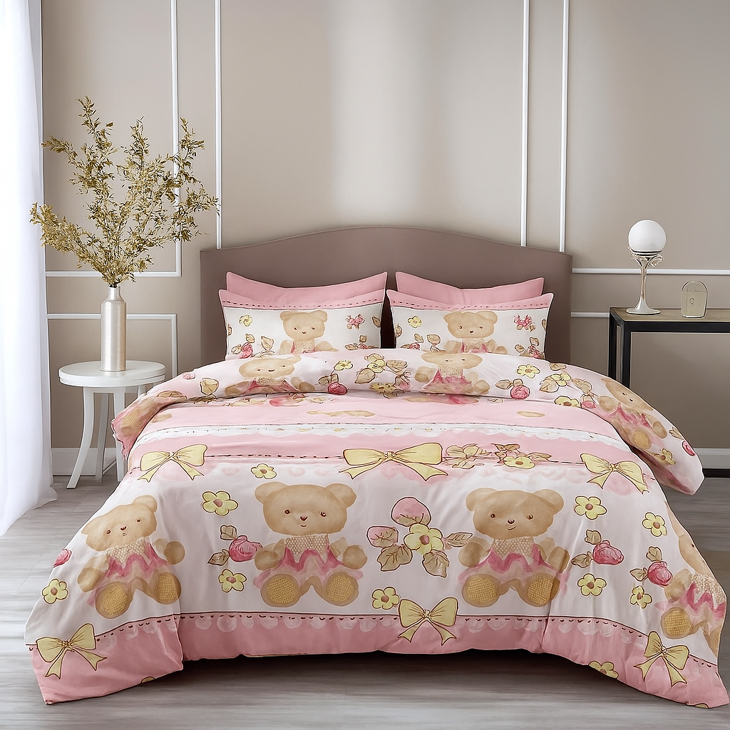 The highlight of this bedsheet is its adorable teddy bear pattern, paired with bows, floral accents, and decorative detailing. The playful characters instantly brighten up the room, creating a cheerful and inviting vibe perfect for kids. The vibrant yet gentle tones make it versatile enough to match various room decors.