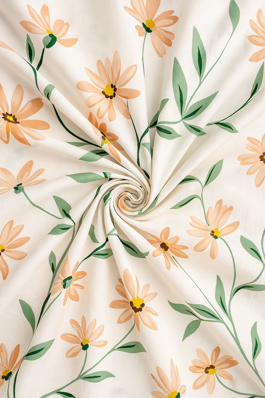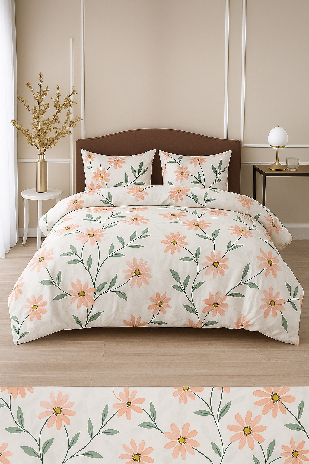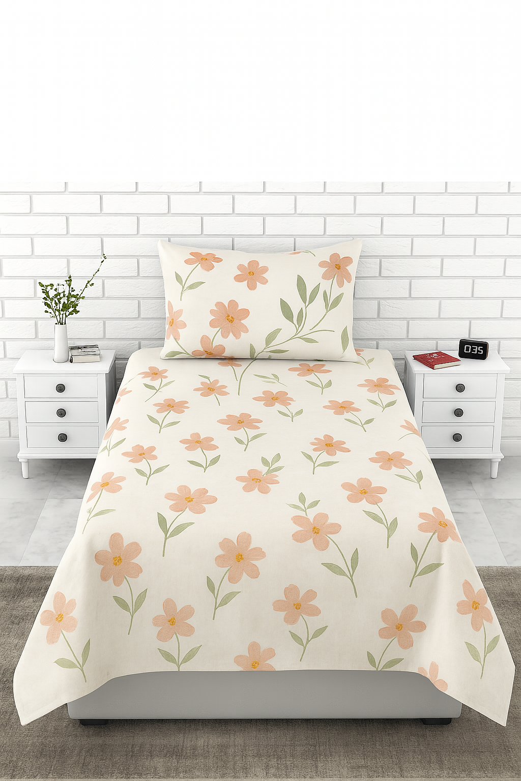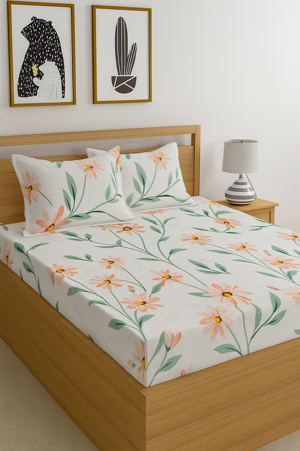 The standout feature of this bedsheet is its delicate peach daisy-style flowers paired with lush green leafy stems printed beautifully on a soothing cream background. The pastel tones add freshness and calmness, creating a natural, garden-inspired vibe in your room. This peach floral bedsheet uplifts your décor instantly and blends perfectly with both modern and classic interiors.