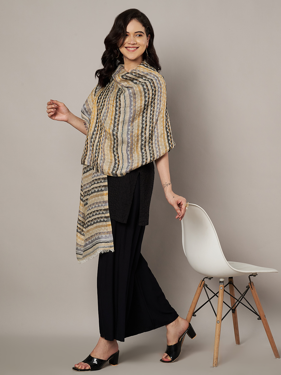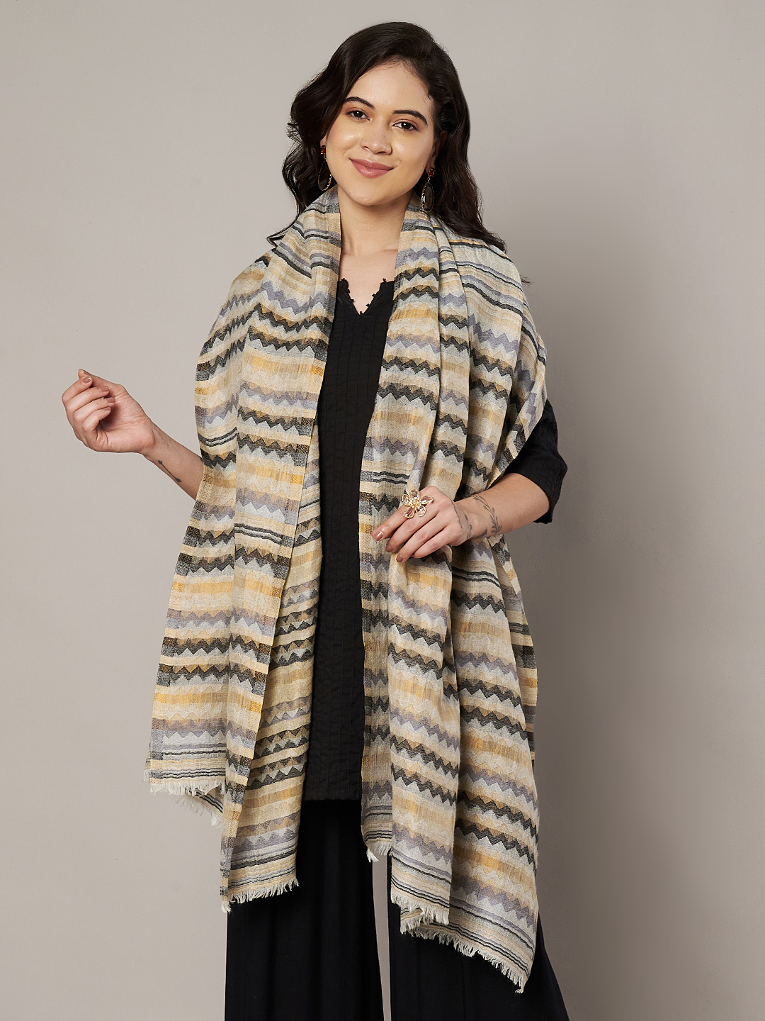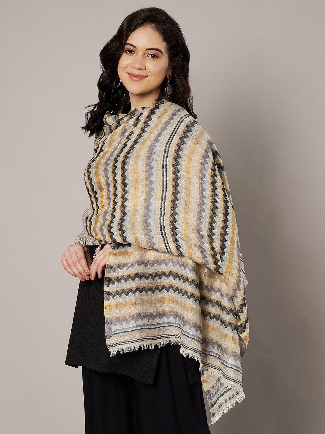 The Zig-Zag Stole combines playful design with luxurious comfort. Additionally, it is lightweight, travel-friendly, and versatile, making it the perfect accessory for women who value elegance and style. Finally, add this stole to your wardrobe and enjoy an accessory that is both contemporary and timeless.