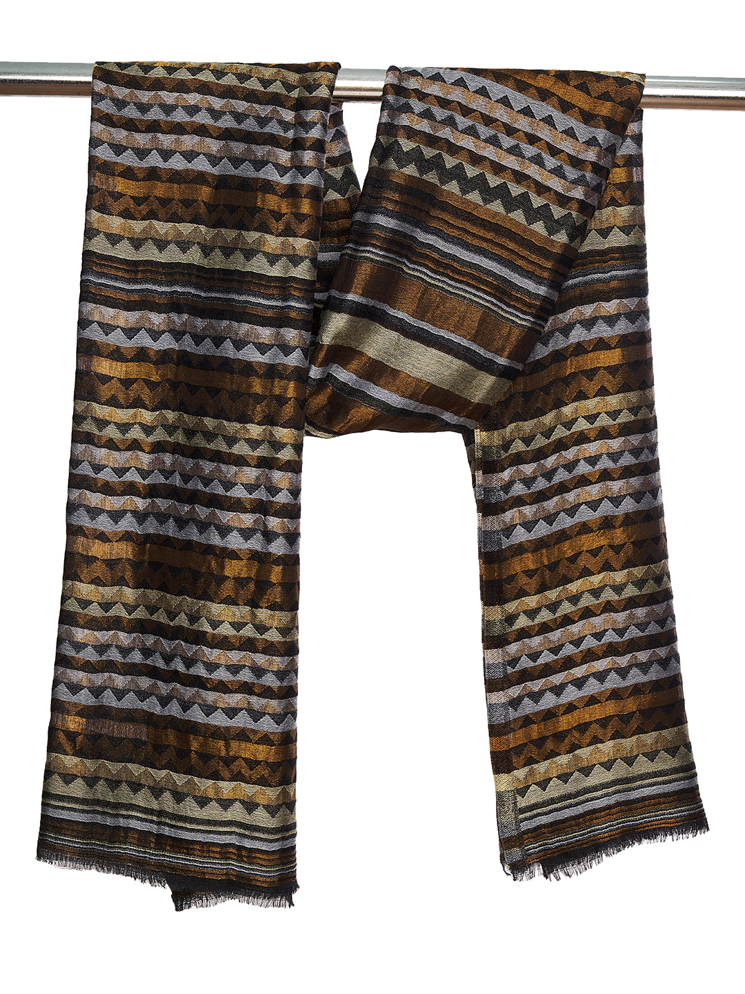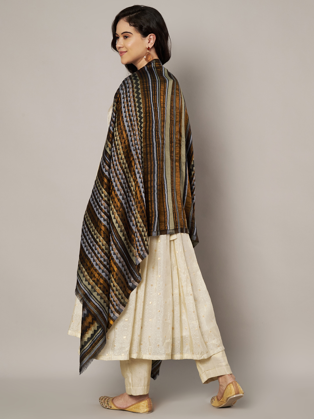 Crafted from fine wool with zari, this stole offers a luxurious blend of softness, warmth, and subtle shimmer. As a result, the Zig-Zag Stole feels comfortable on the skin while adding a festive charm. Furthermore, the breathable fabric makes it suitable for year-round wear, from breezy evenings to special occasions.